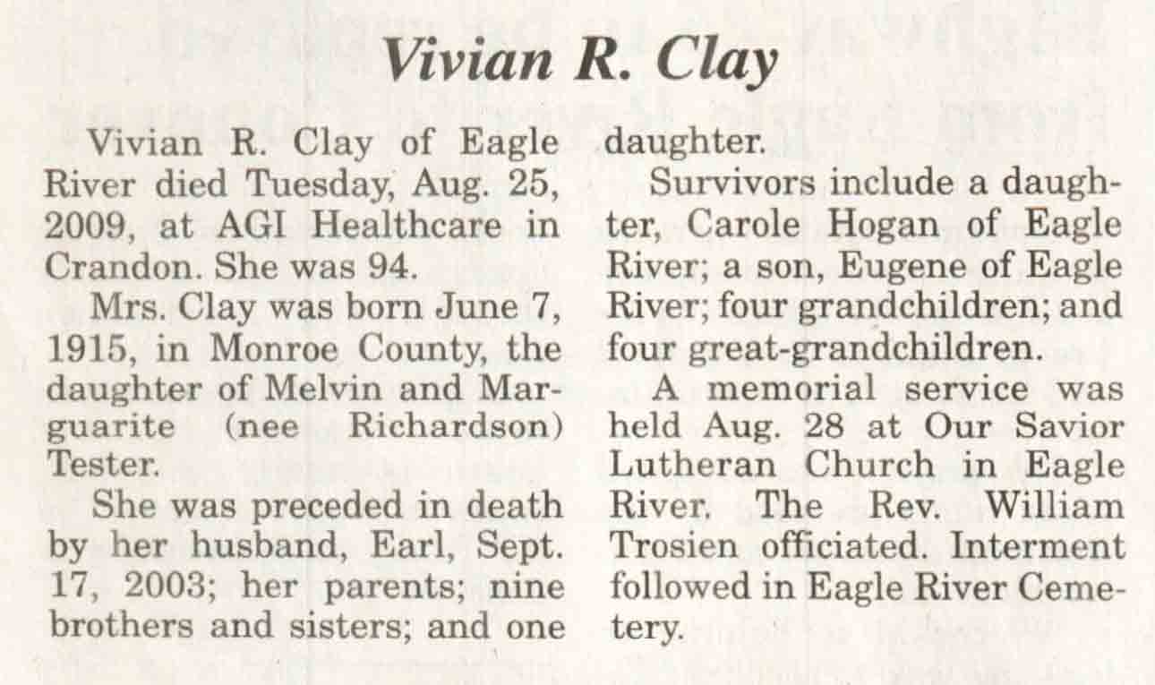 | Clay | Vivian R (Tester) | 07 Jun 1915 | 25 Aug 2009 | V N-R | 02 Sep 2009 | 4A |