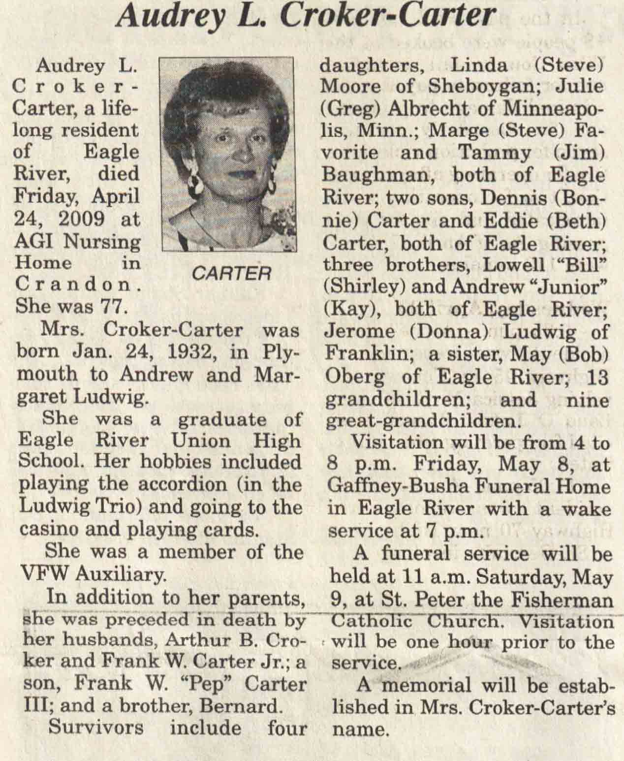 | Croker-Carter | Audrey L (Ludwig) | 24 Jan 1932 | 24 Apr 2009 | V N-R | 29 Apr 2009 | 4 |