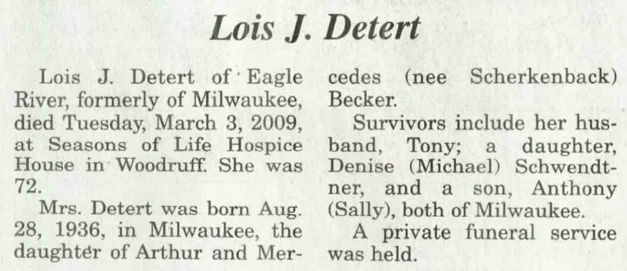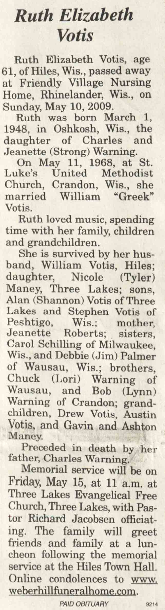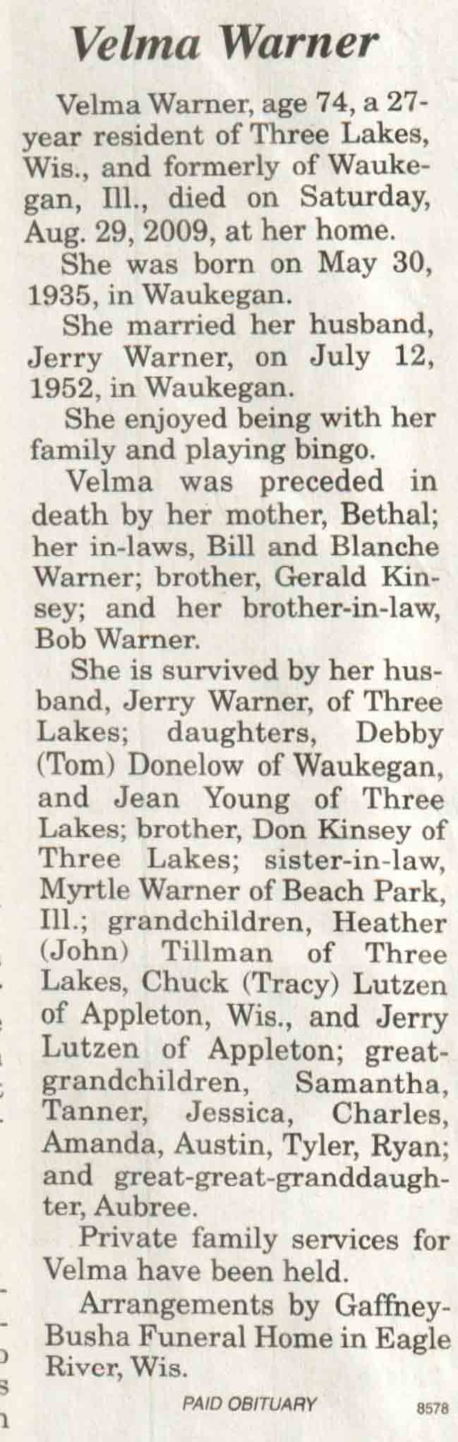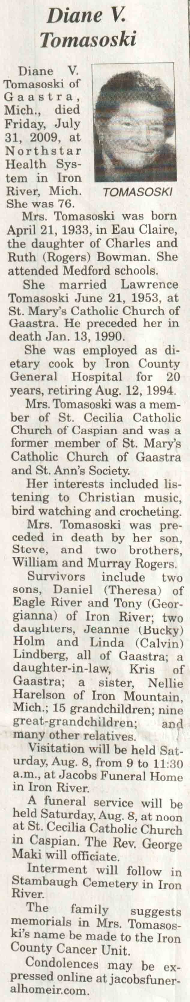 | Tomasoski | Diane V (Bowman) | 21 Apr 1933 | 31 Jul 2009 | V N-R | 05 Aug 2009 | 4A |
