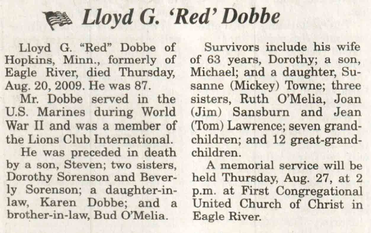 | Dobbe | Lloyd G 'Red' | c 1922 | 20 Aug 2009 | V N-R | 26 Aug 2009 | 4A |