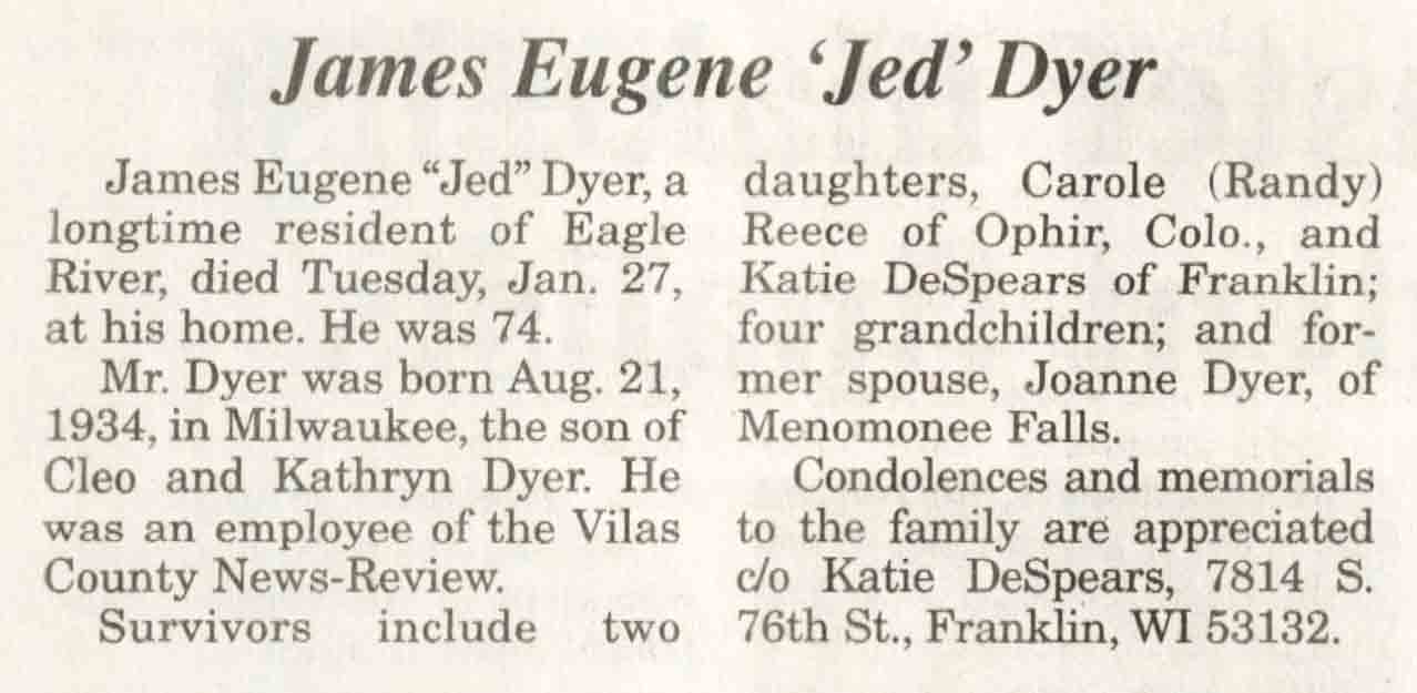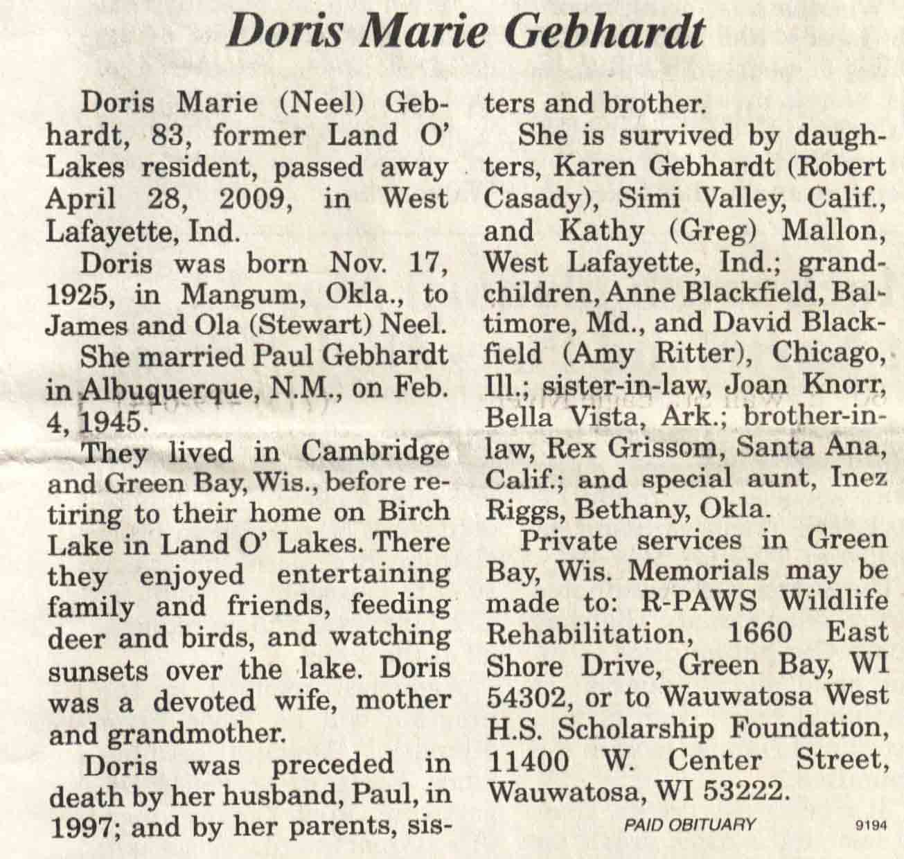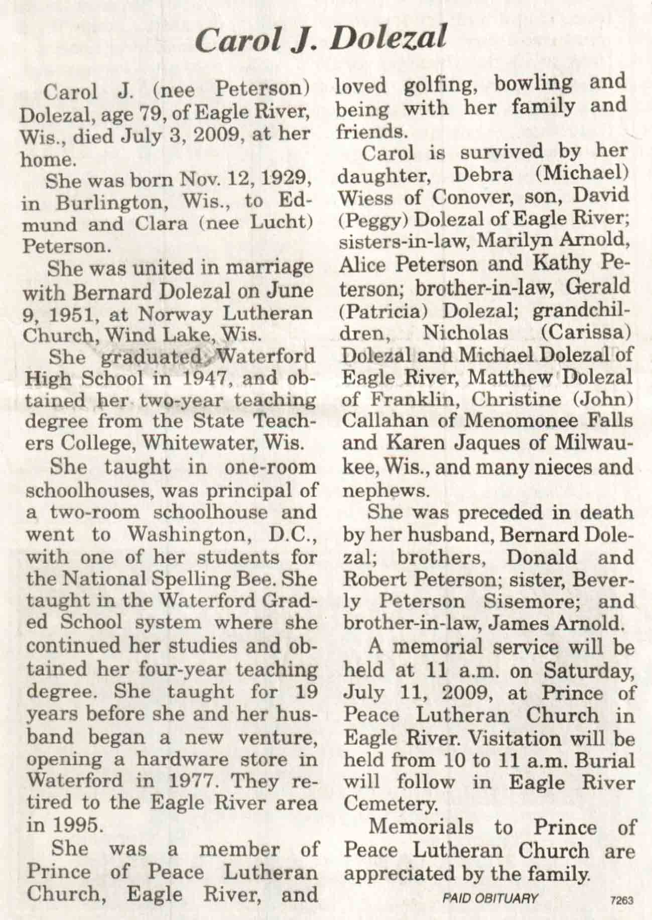 | Dolezal | Carol J (Peterson) | 12 Nov 1929 | 03 Jul 2009 | V N-R | 08 Jul 2009 | 4A |