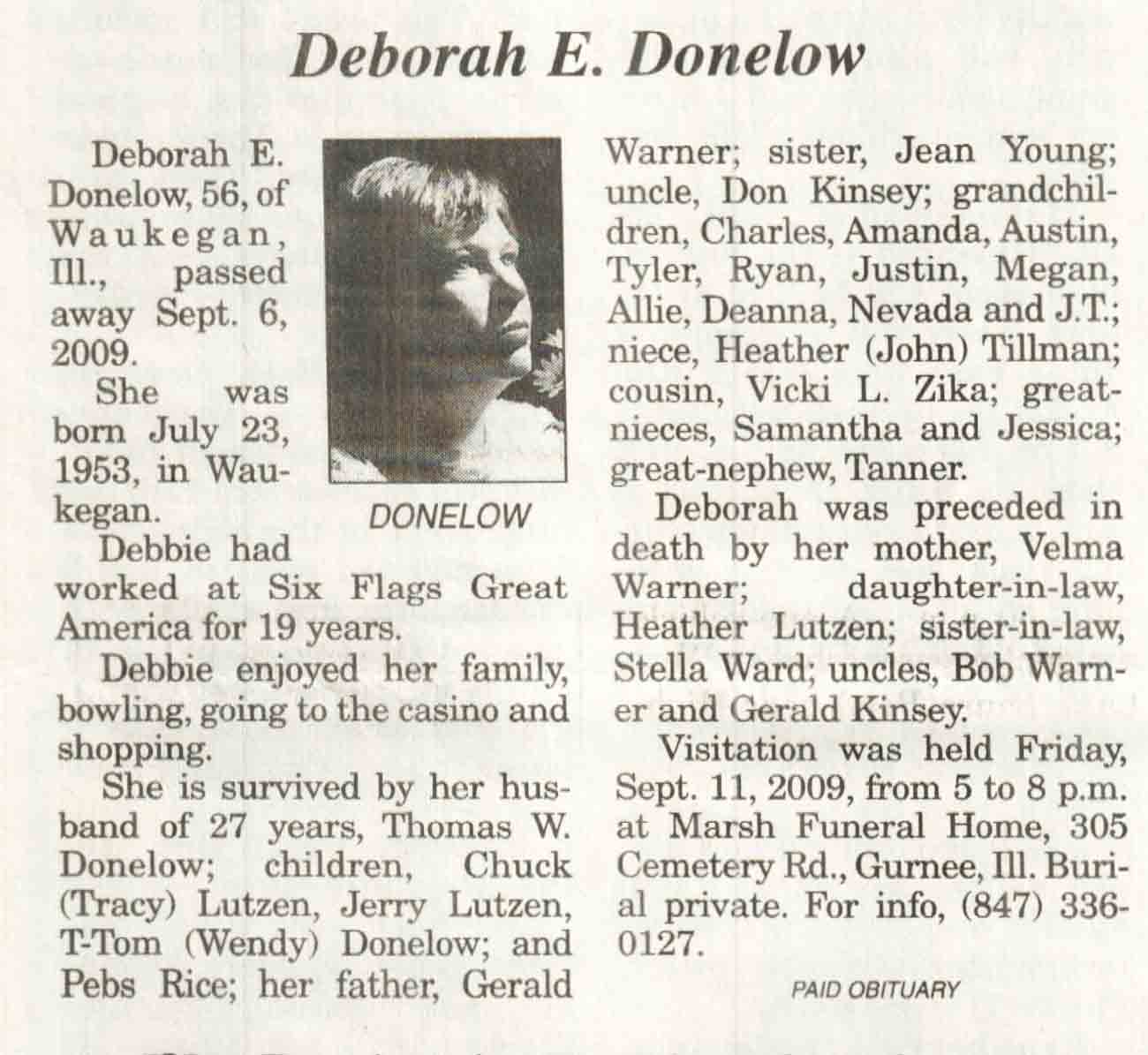 | Donelow | Deborah E (Warner) | 23 Jul 1953 | 06 Sep 2009 | V N-R | 16 Sep 2009 | 4A |