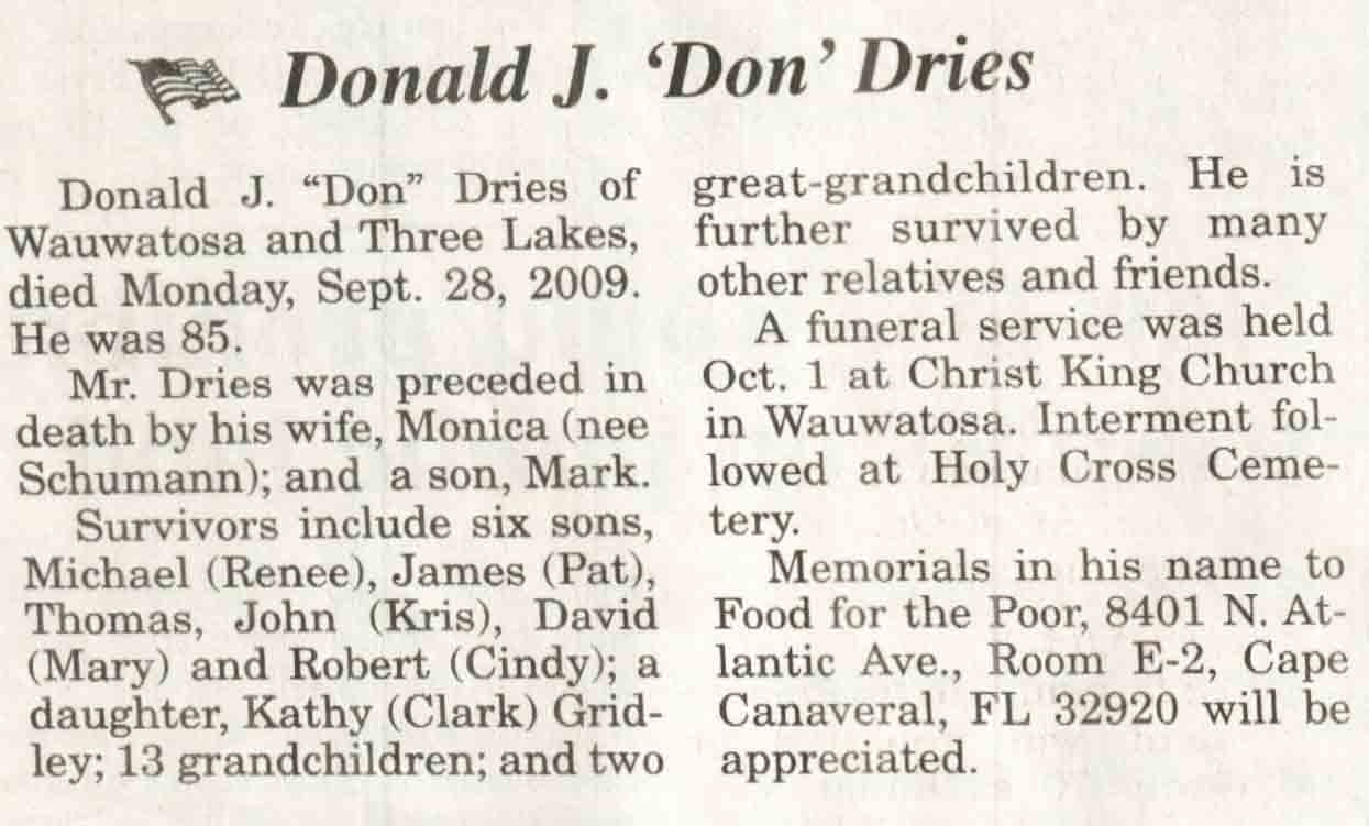 | Dries | Donald J 'Don' | c 1924 | 28 Sep 2009 | V N-R | 07 Oct 2009 | 4A |