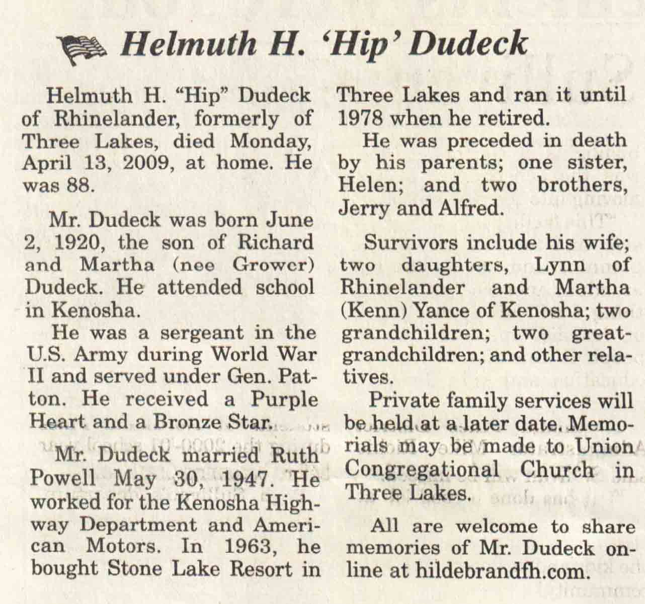 | Dudeck | Helmuth H 'Hip' | 02 Jun 1920 | 13 Apr 2009 | V N-R | 22 Apr 2009 | 4 |