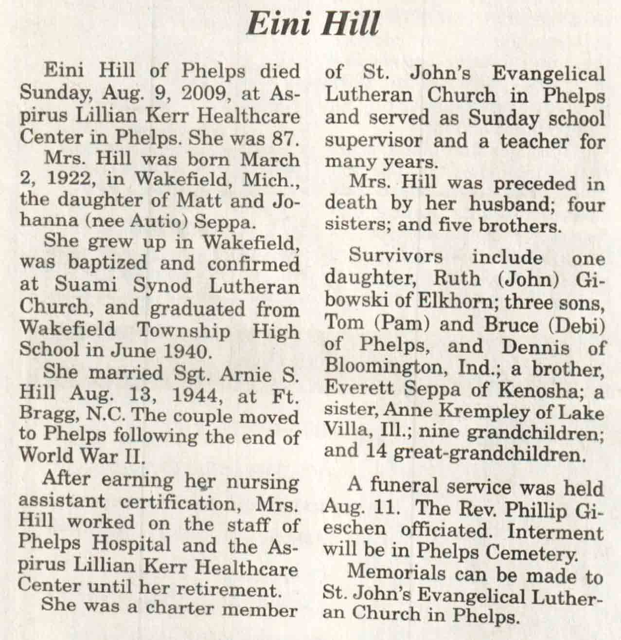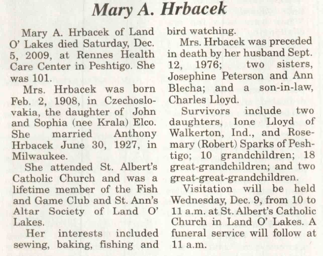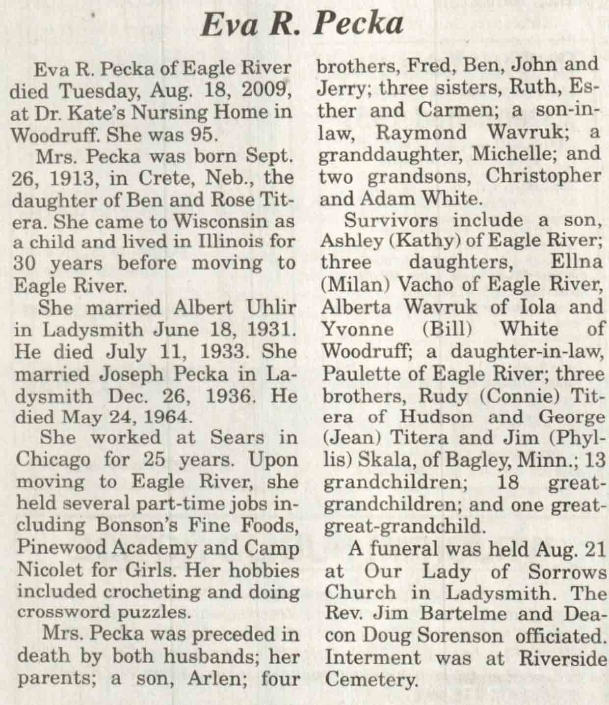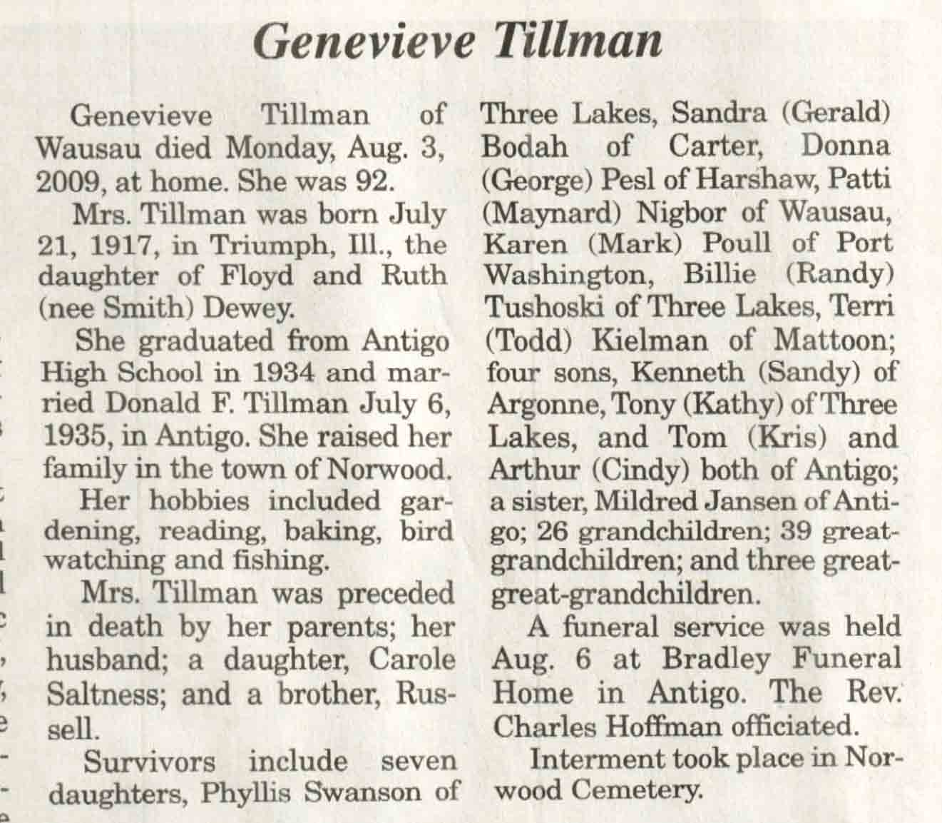 | Tillman | Genevieve (Dewey) | 21 Jul 1917 | 03 Aug 2009 | V N-R | 12 Aug 2009 | 4A |