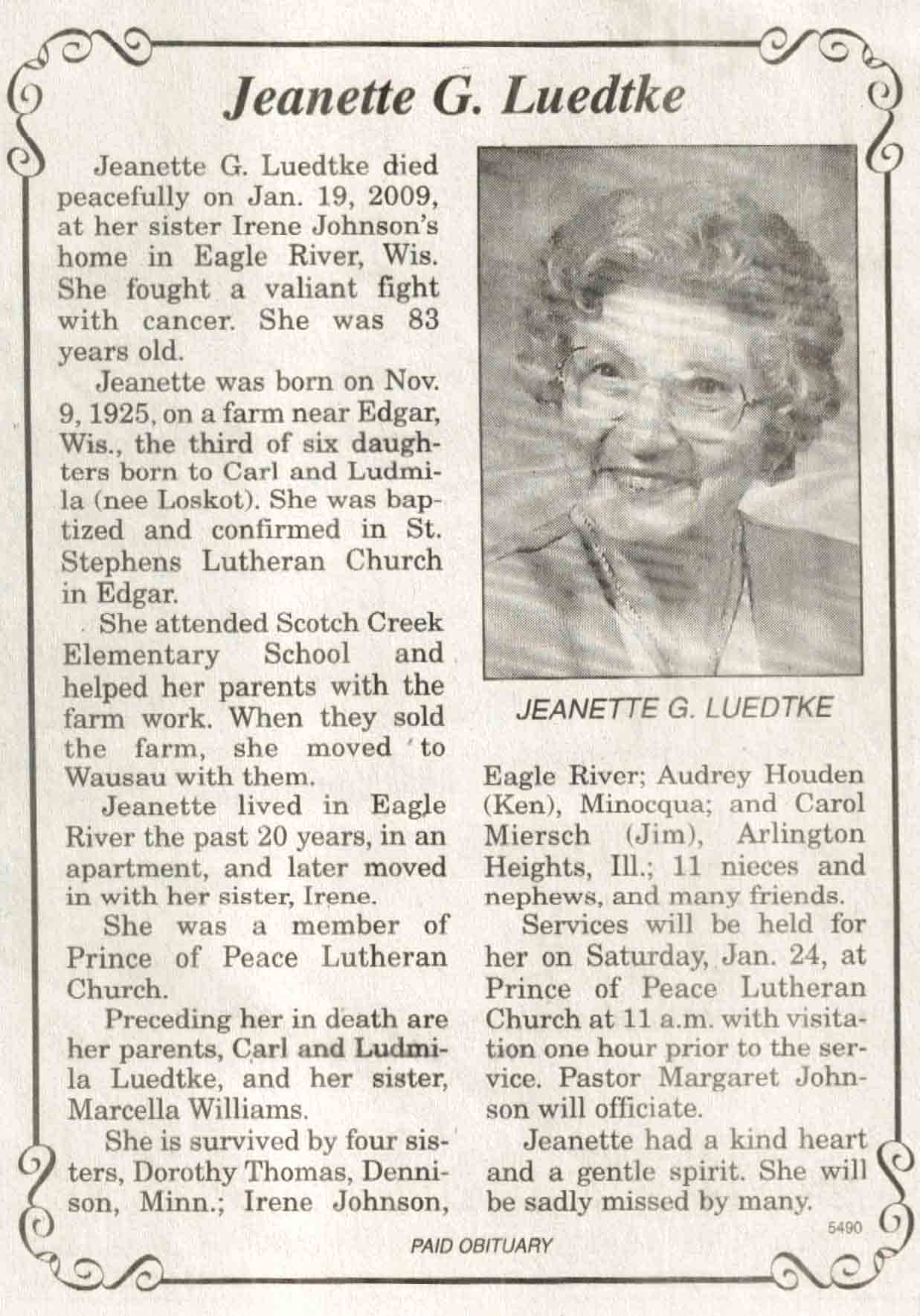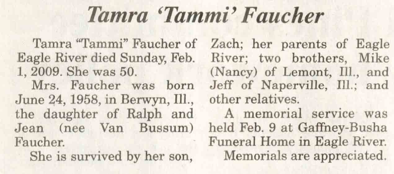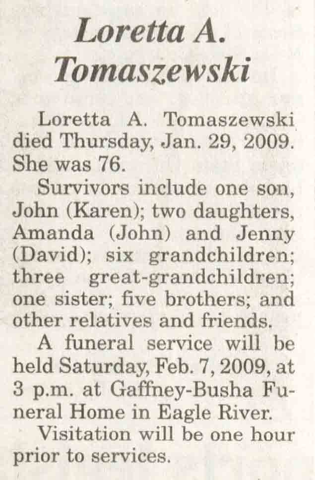 | Tomaszewski | Loretta A | c 1933 | 29 Jan 2009 | V N-R | 04 Feb 2009 | 4 |