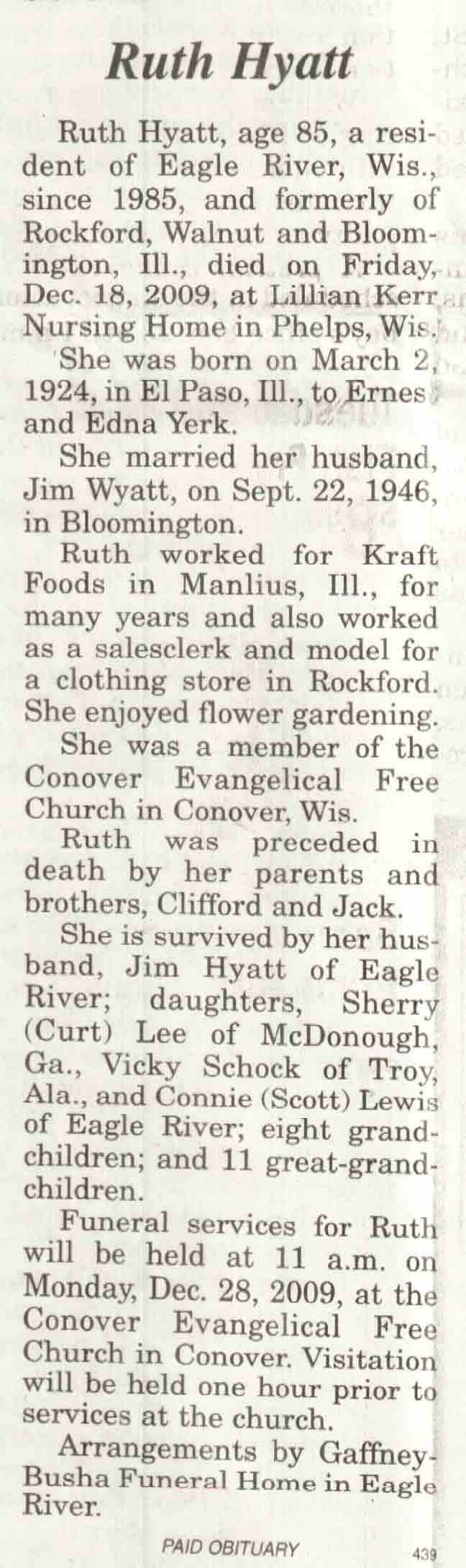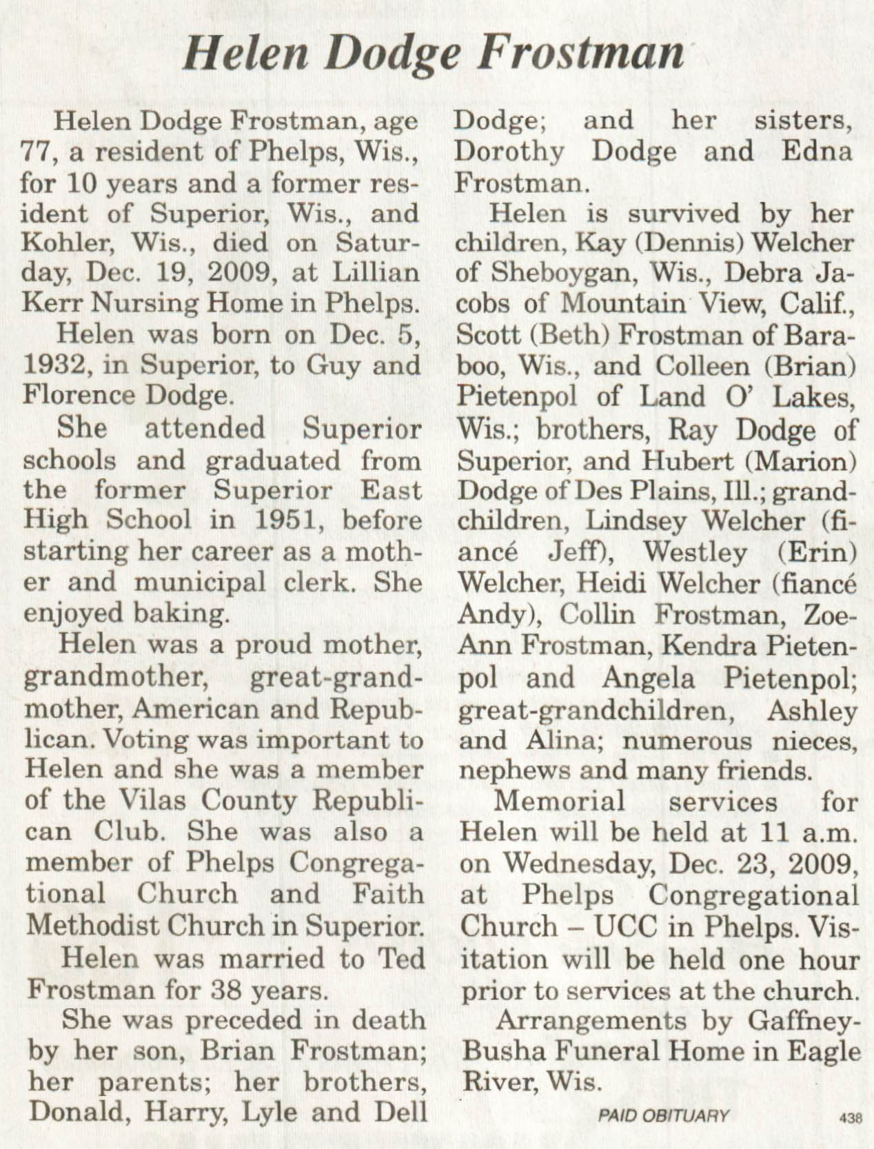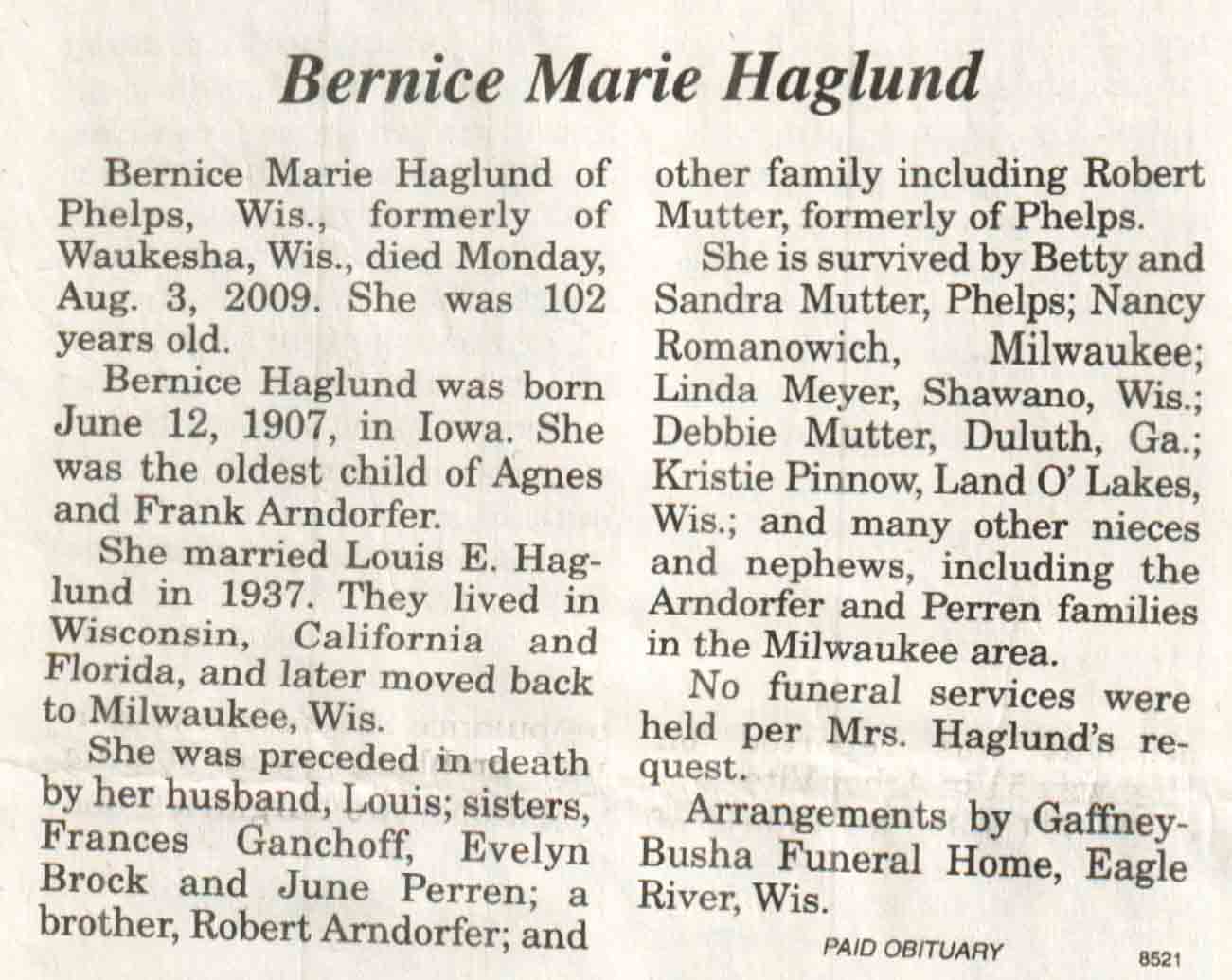 | Dagro | Verna Pauline (Hendrickson) | 12 Nov 1922 | 04 Apr 2009 | V N-R | 13 May 2009 | 4A |