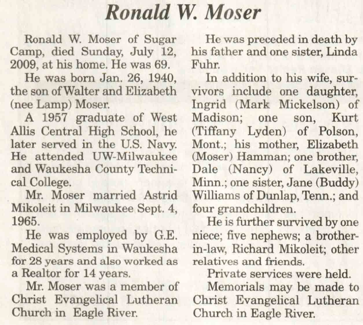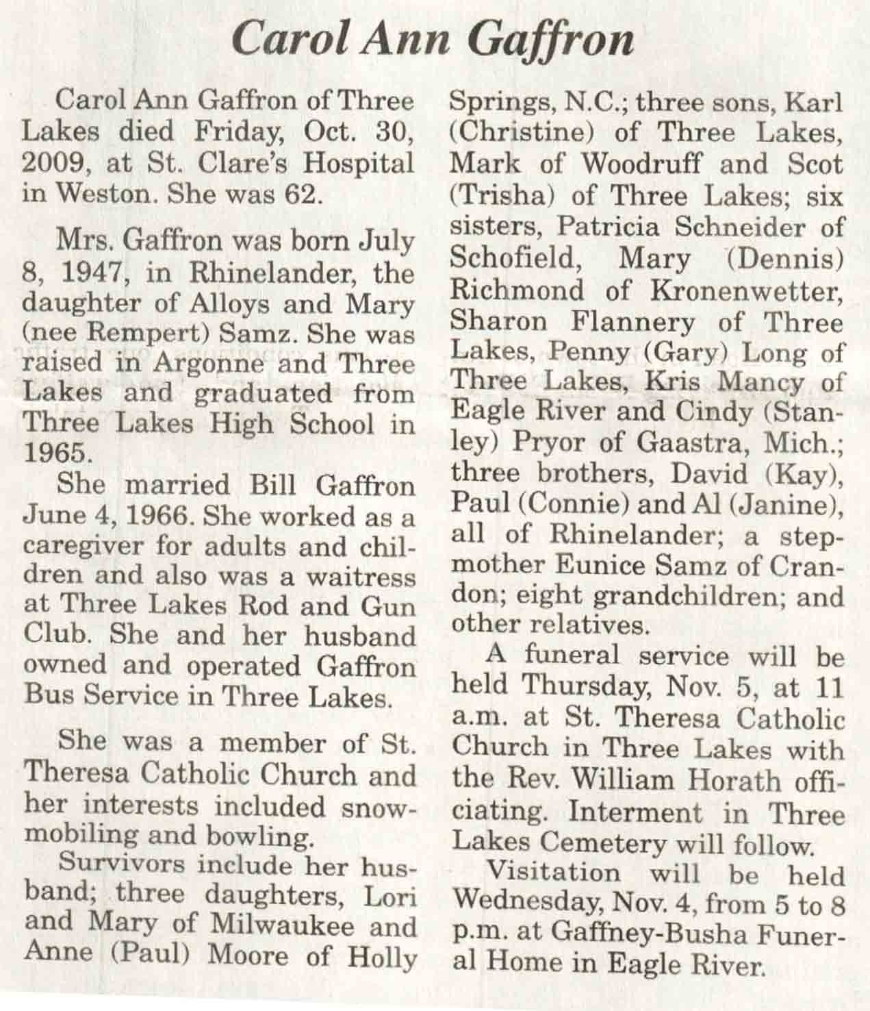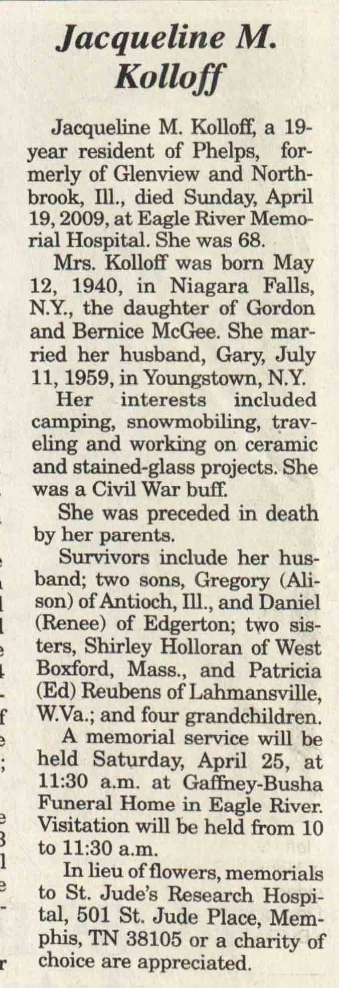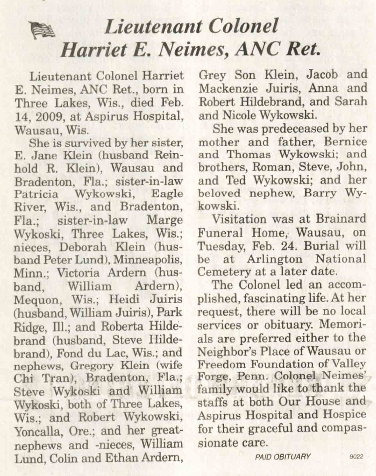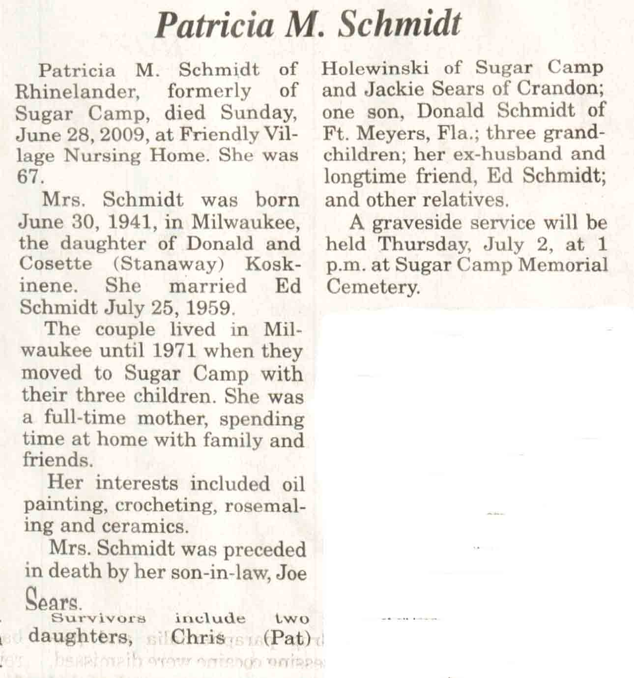 | Schmidt | Patricia M (Koskinene) | 30 Jun 1941 | 28 Jun 2009 | V N-R | 01 Jul 2009 | 4A |