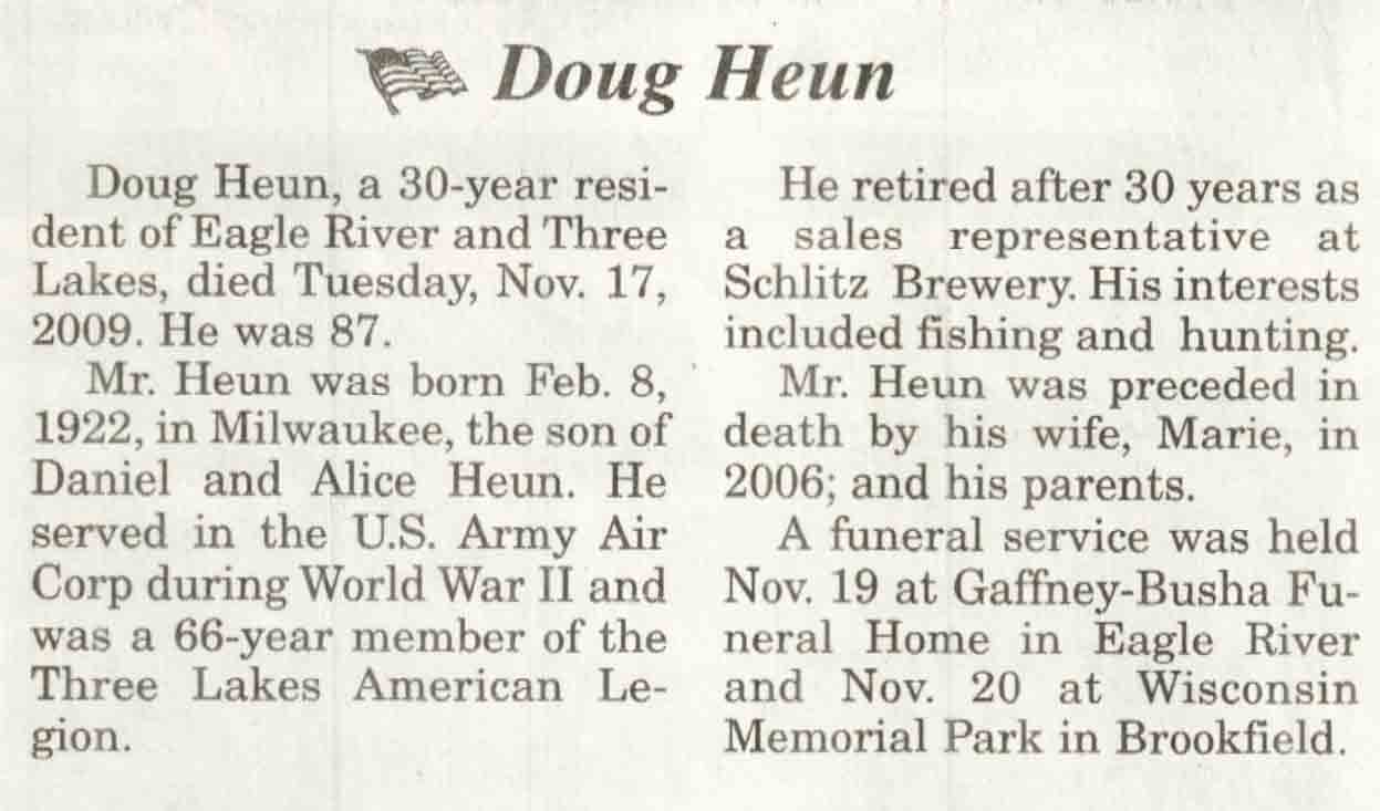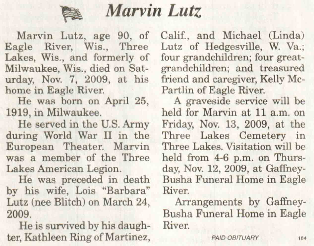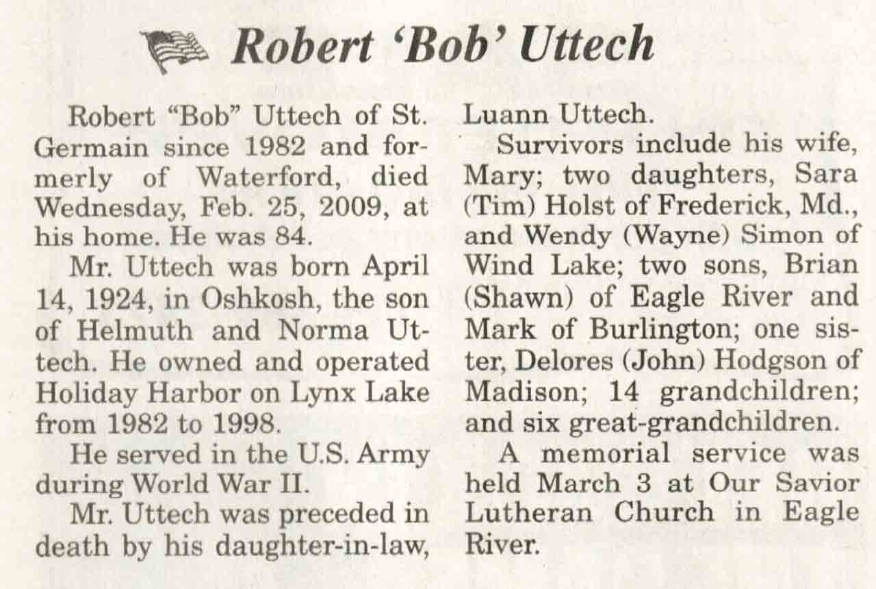 | Uttech | Robert 'Bob' | 14 Apr 1924 | 25 Feb 2009 | V N-R | 04 Mar 2009 | 4A |