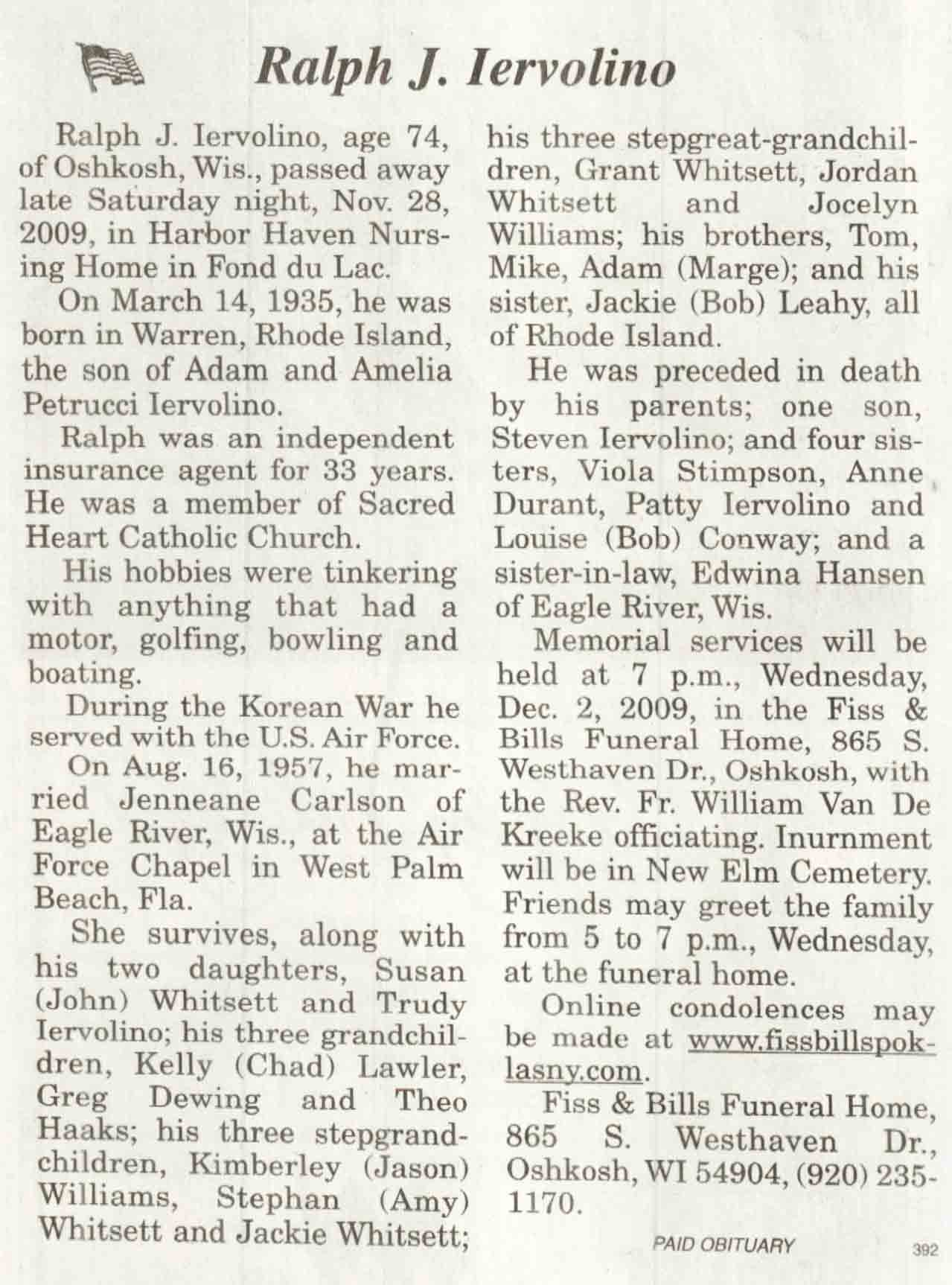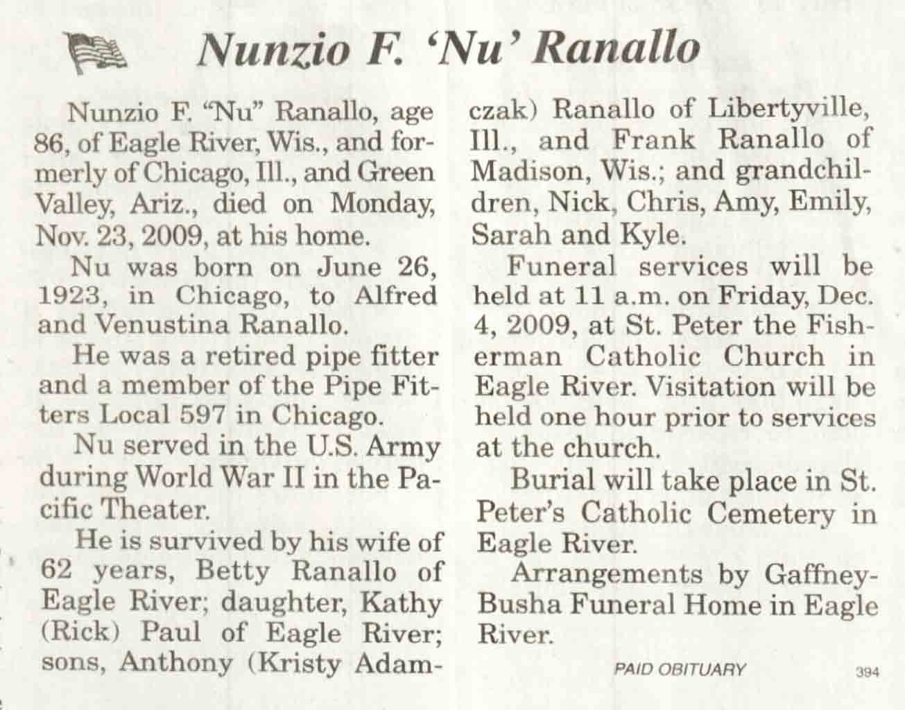 | Ranallo | Nunzio F 'Nu' | 26 Jun 1923 | 23 Nov 2009 | V N-R | 02 Dec 2009 | 4A |