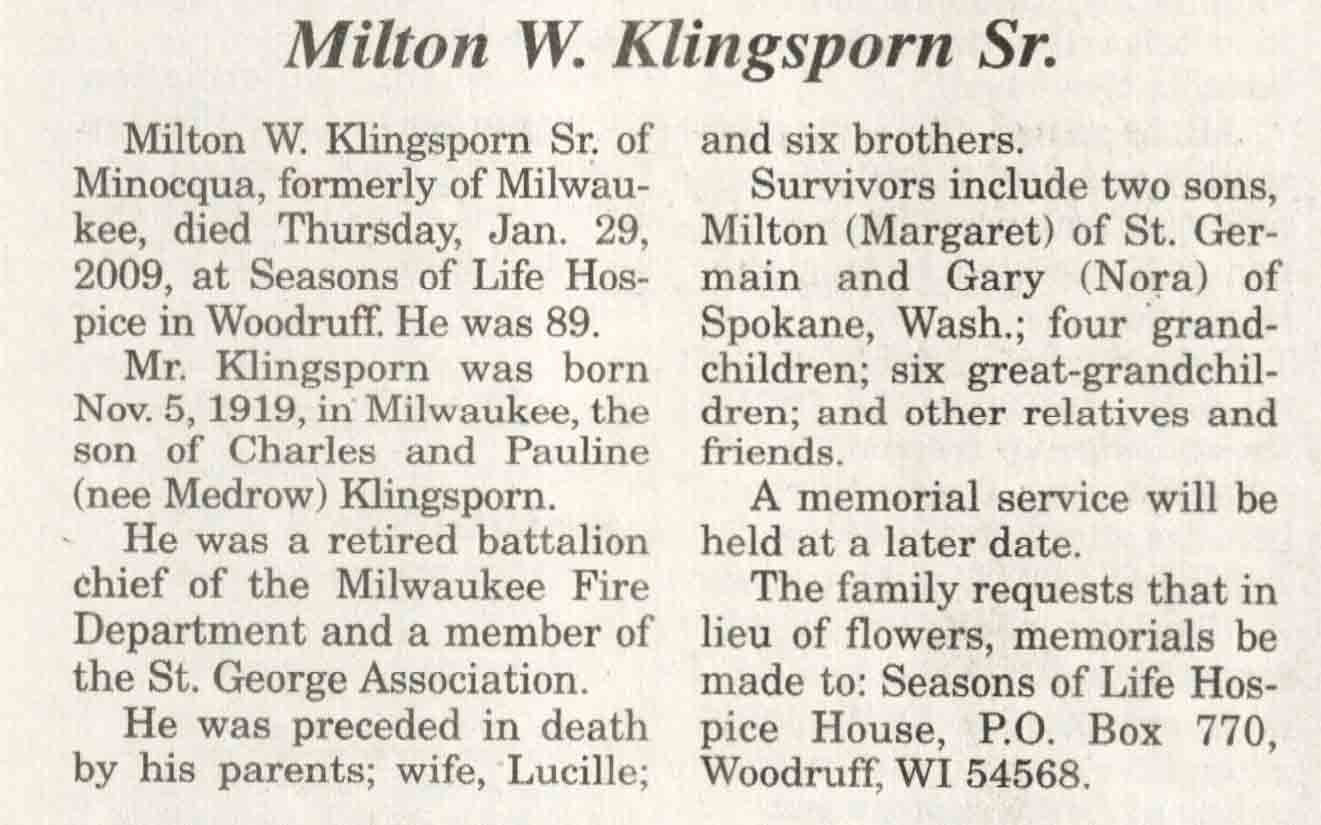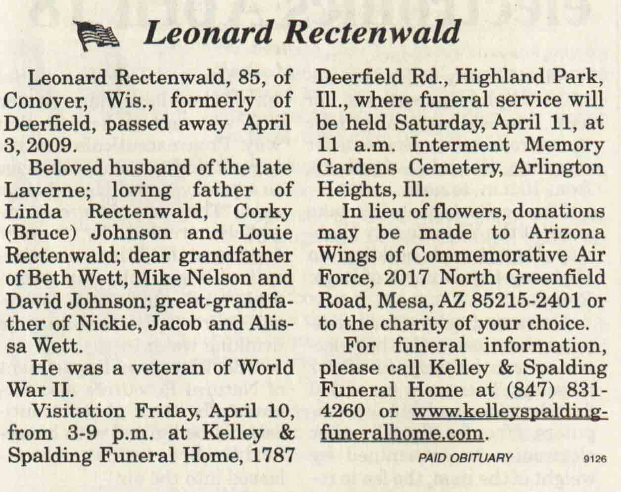 | Schaumberg | Allen 'Al' | 23 Jan 1925 | 18 Dec 2009 | V N-R | 30 Dec 2009 | 4 |