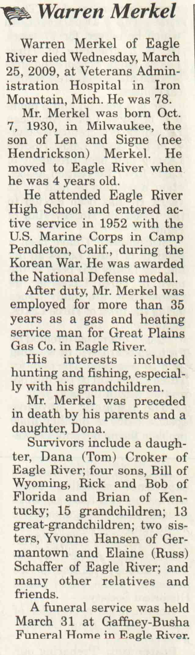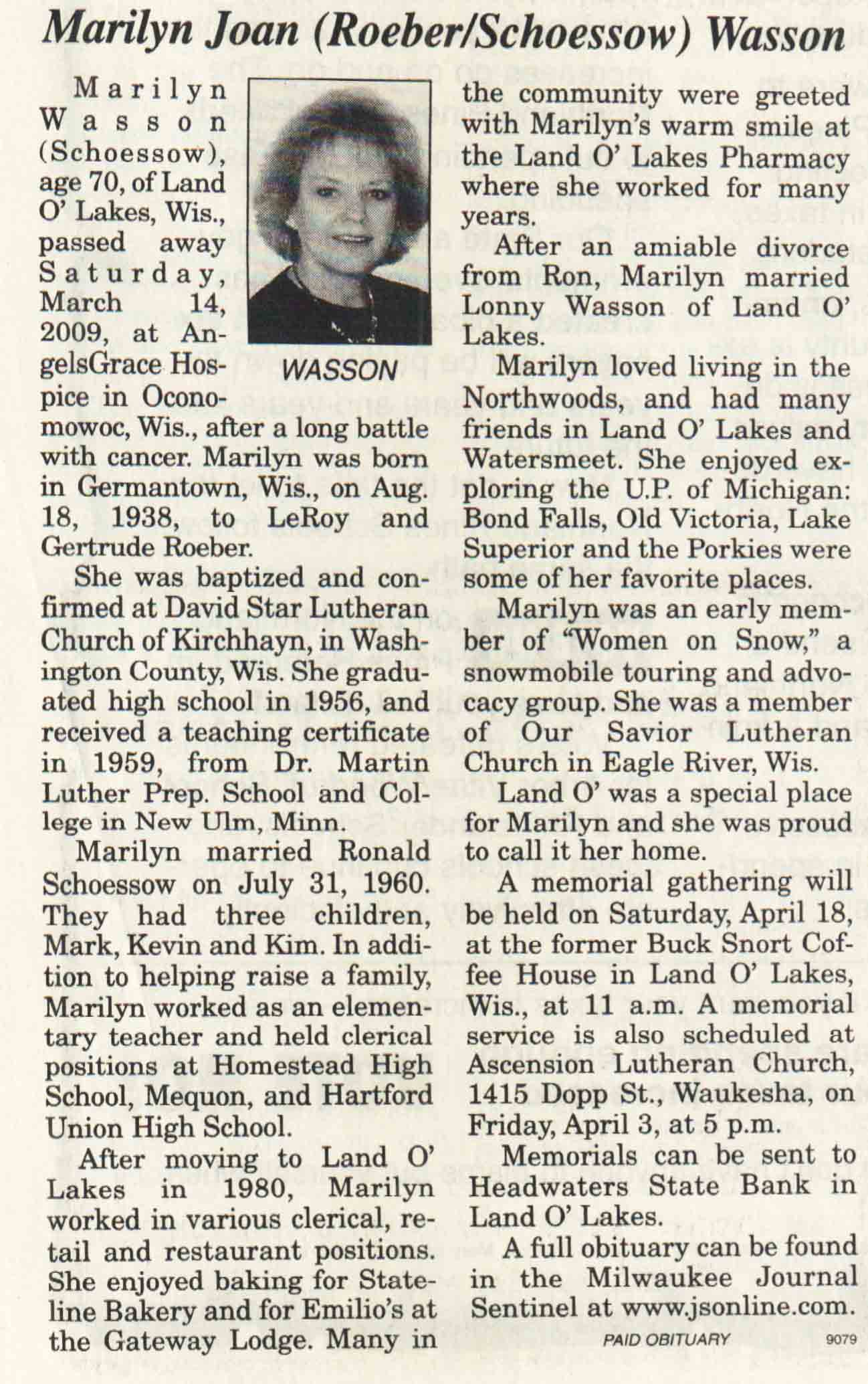 | Wasson | Marilyn Joan (Roeber) | 18 Aug 1938 | 14 Mar 2009 | V N-R | 11 Apr 2009 | 4A |