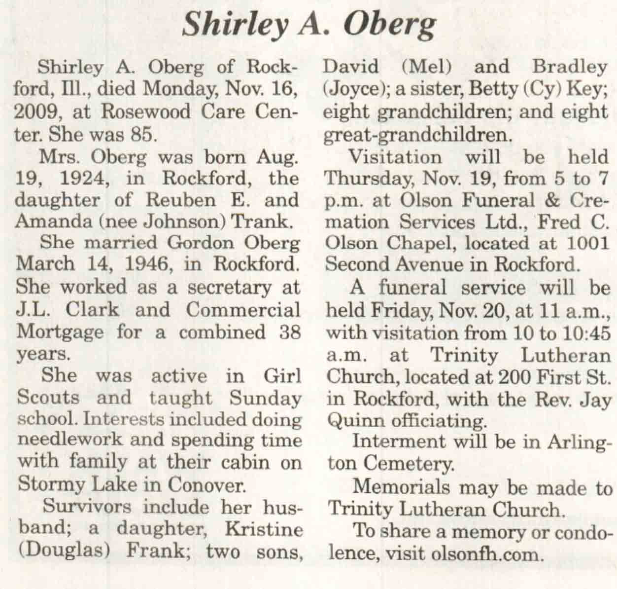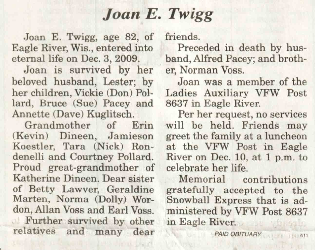 | Twigg | Joan E (Voss) | c 1922 | 03 Dec 2009 | V N-R | 09 Dec 2009 | 4A |