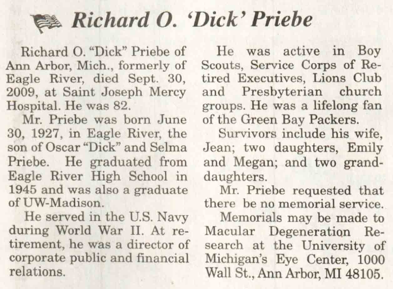 | Priebe | Richard O 'Dick' | 30 Jun 1927 | 30 Sep 2009 | V N-R | 21 Oct 2009 | 4A |