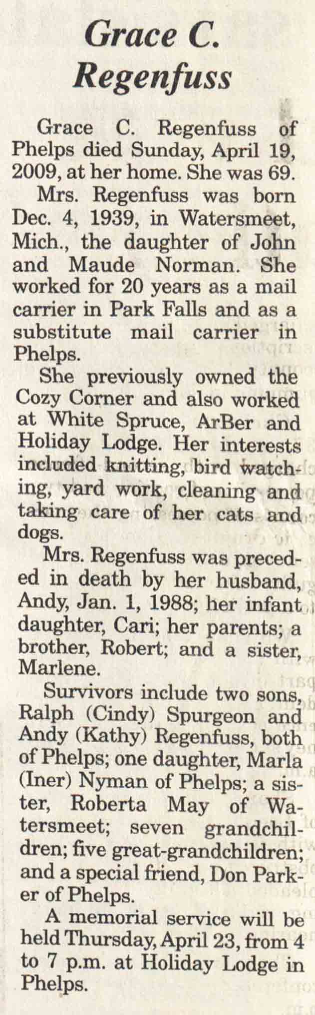 | Regenfuss | Grace C (Norman) | 04 Dec 1939 | 19 Apr 2009 | V N-R | 22 Apr 2009 | 4 |