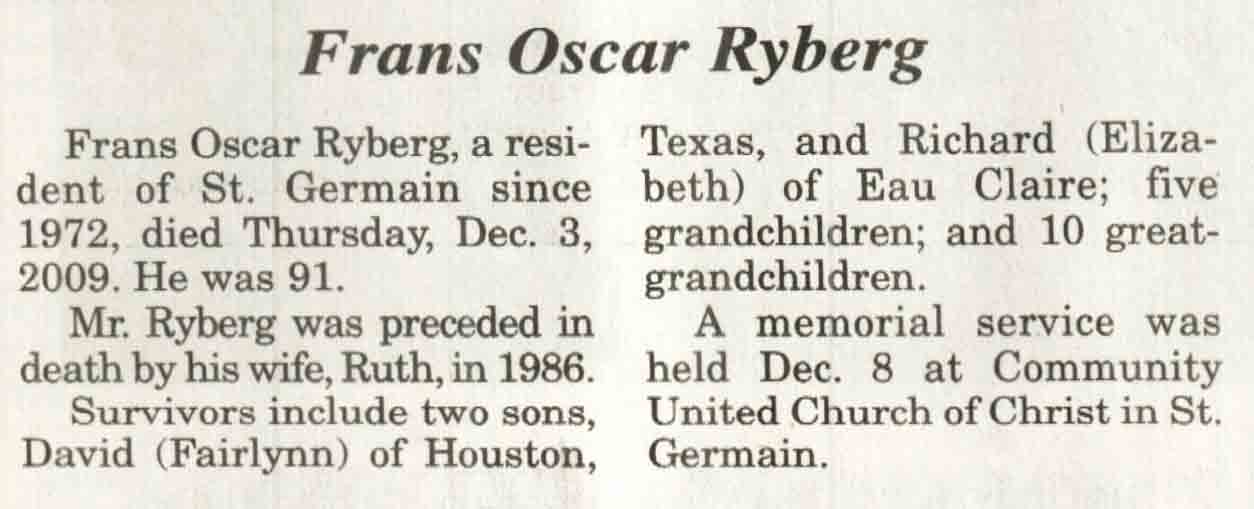| Ryberg | Frans Oscar | c 1918 | 03 Dec 2009 | V N-R | 09 Dec 2009 | 4A |