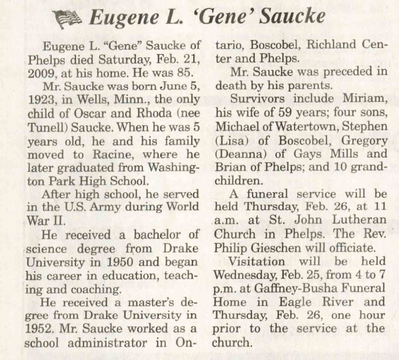 | Saucke | Eugene L 'Gene' | 05 Jun 1923 | 21 Feb 2009 | V N-R | 25 Feb 2009 | 4A |