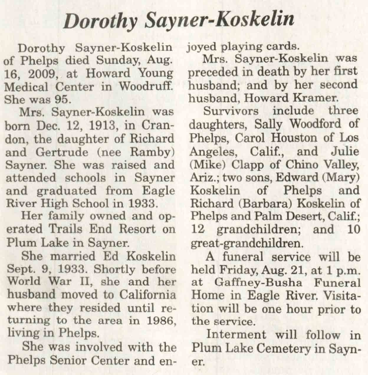 | Sayner-Koskelin | Dorothy (Sayner) | 12 Dec 1913 | 16 Aug 2009 | V N-R | 19 Aug 2009 | 4A |