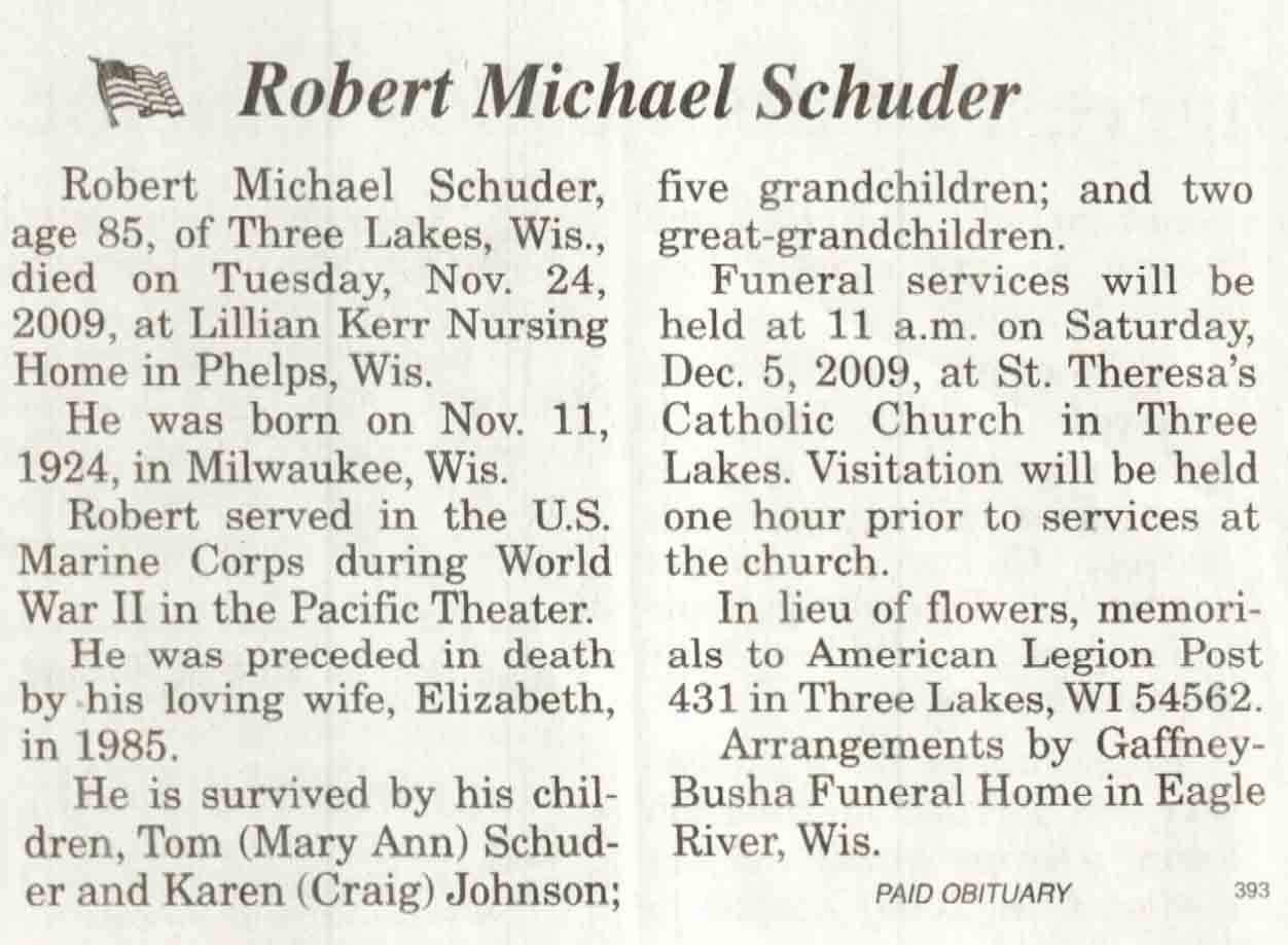 | Schuder | Robert Michael | 11 Nov 1924 | 24 Nov 2009 | V N-R | 02 Dec 2009 | 4A |