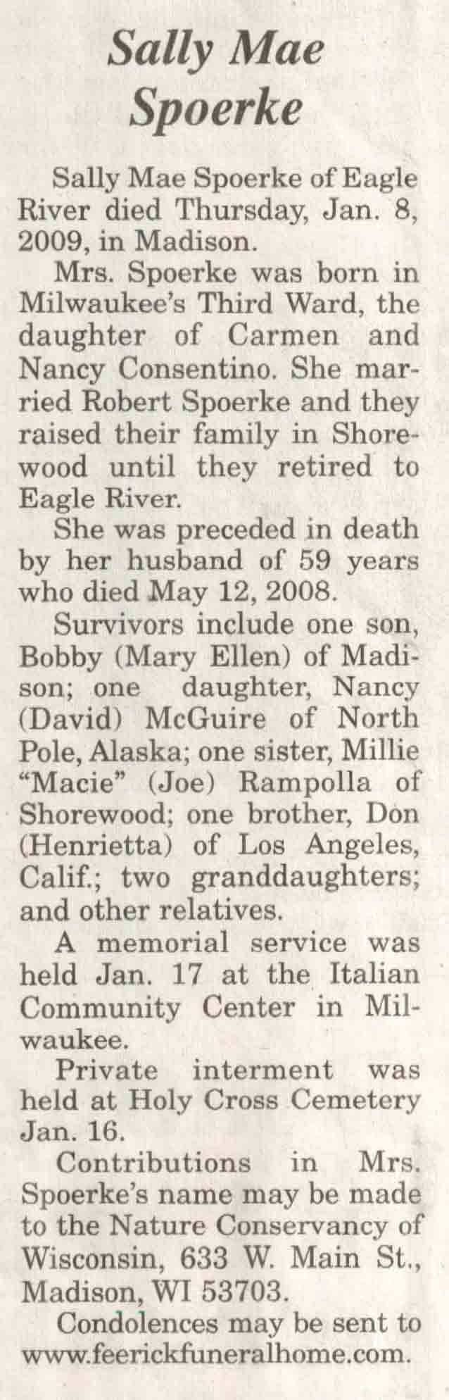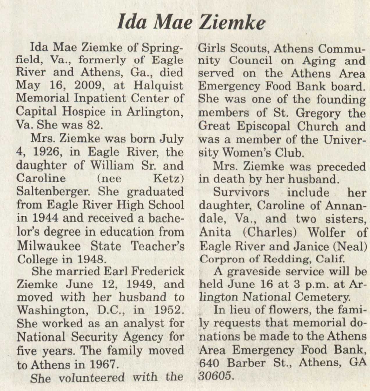 | Ziemke | Ida Mae (Saltenberger) | 04 Jul 1926 | 16 May 2009 | V N-R | 27 May 2009 | 4A |