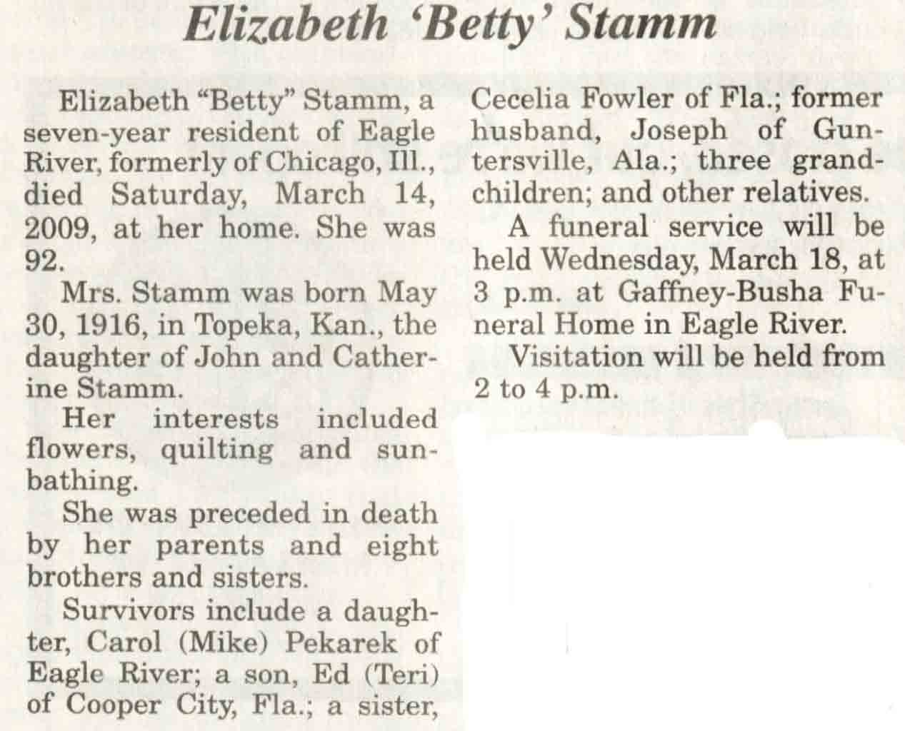 | Stamm | Elizabeth 'Betty' | 30 Mar 1916 | 14 Mar 2009 | V N-R | 18 Mar 2009 | 4A |