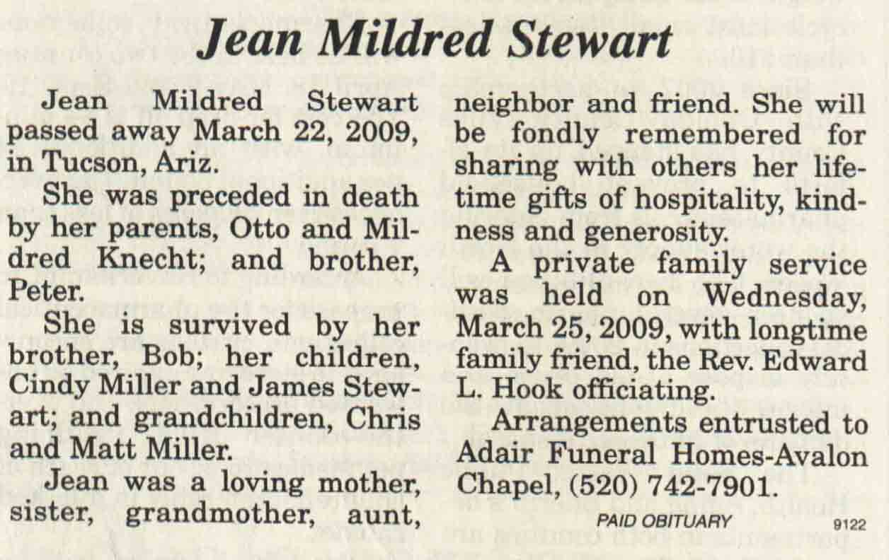 | Stewart | Jean Mildred (Knecht) | 22 Mar 2009 | V N-R | 08 Apr 2009 | 4 | |