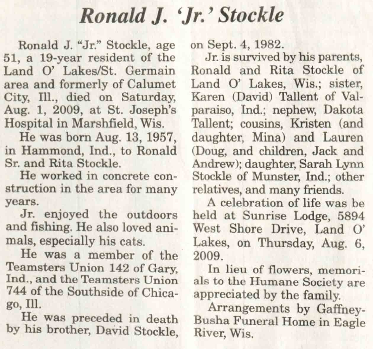 | Stockle | Ronald J, 'Jr' | 13 Aug 1957 | 01 Aug 2009 | V N-R | 12 Aug 2009 | 4A |