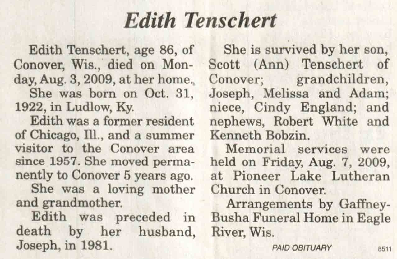 | Tenschert | Edith | 31 Oct 1922 | 03 Aug 2009 | V N-R | 12 Aug 2009 | 4A |
