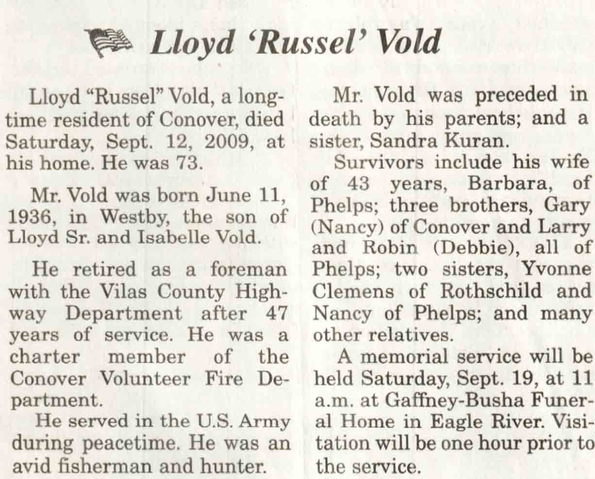 | Vold | Lloyd 'Russel' | 11 Jun 1936 | 12 Sep 2009 | V N-R | 16 Sep 2009 | 4A |