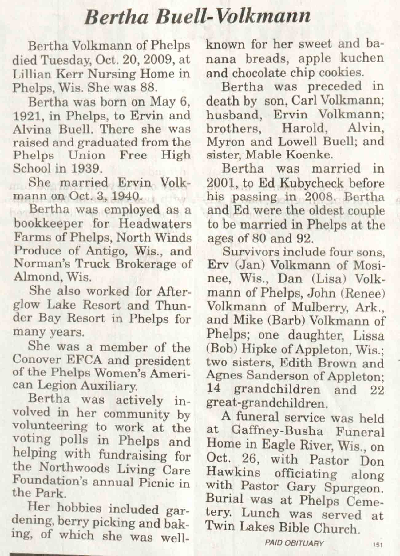 | Volkmann | Bertha (Buell) | 06 May 1921 | 20 Oct 2009 | V N-R | 28 Oct 2009 | 4A |