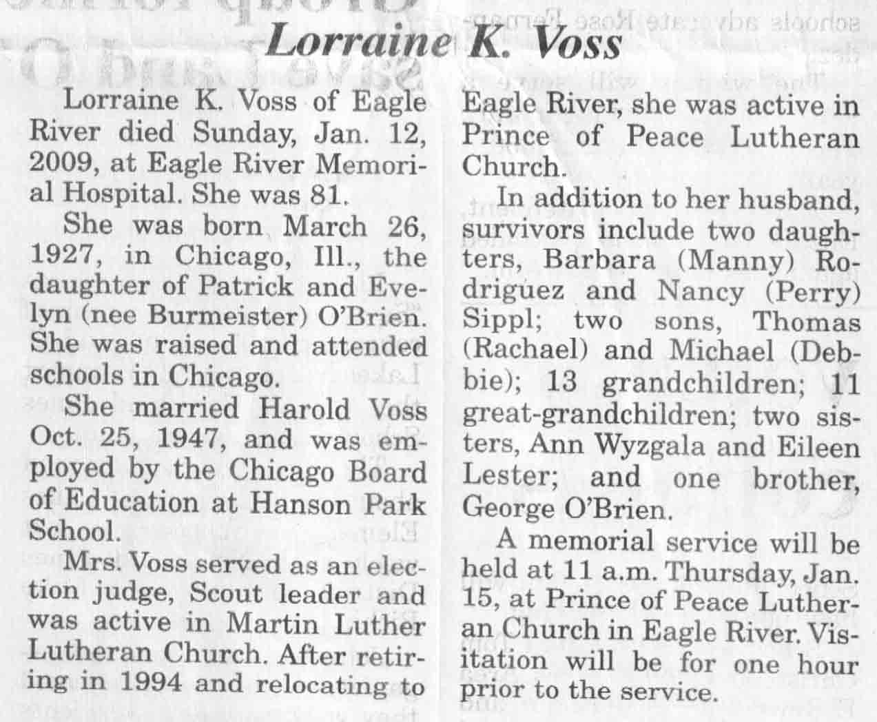| Voss | Lorraine K (O'Brien) | 26 Mar 1927 | 12 Jan 2009 | V N-R | 14 Jan 2009 | 4 |