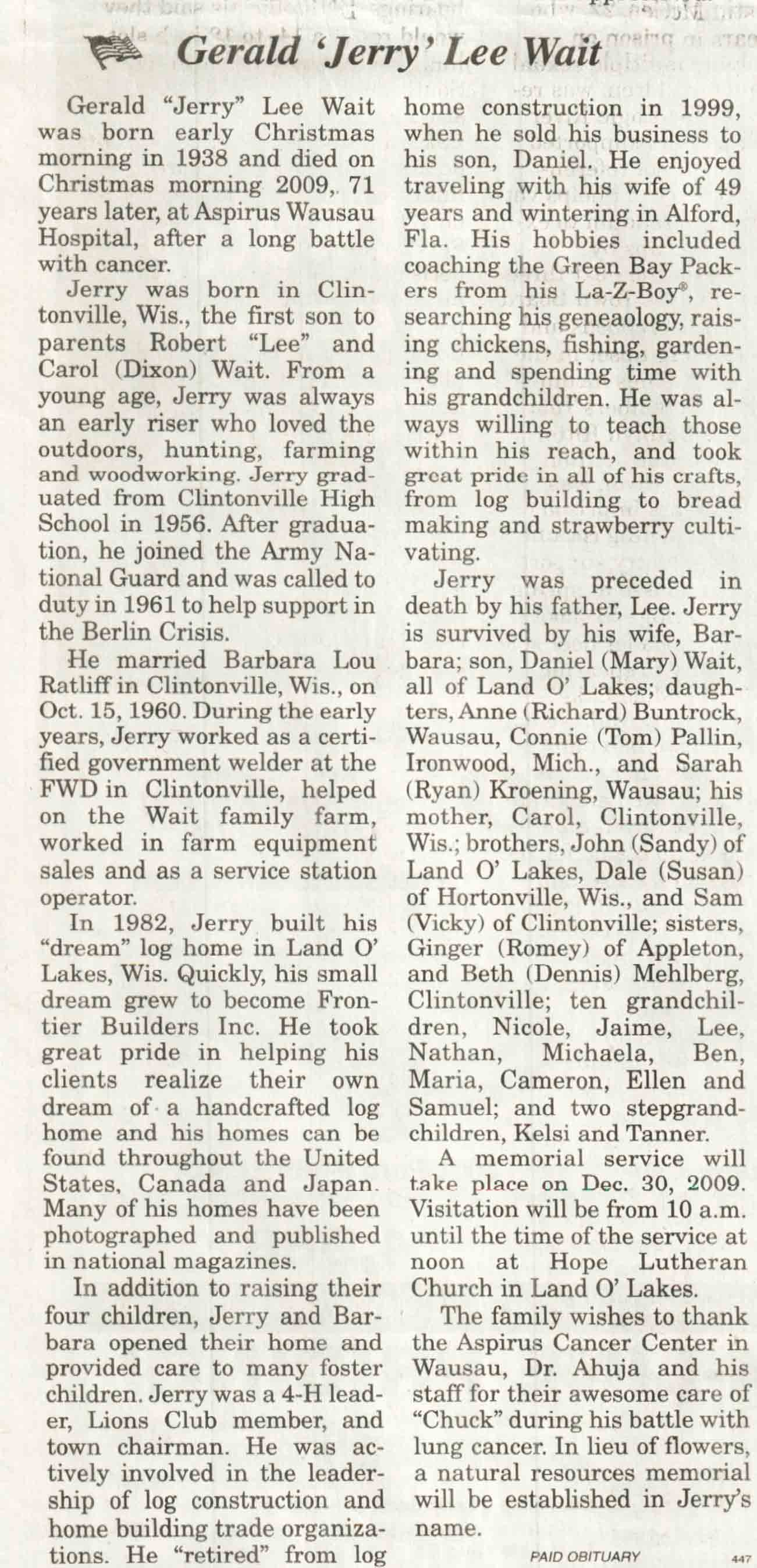 | Wait | Gerald Lee 'Jerry' | 25 Dec 1938 | 25 Dec 2009 | V N-R | 30 Dec 2009 | 4 |