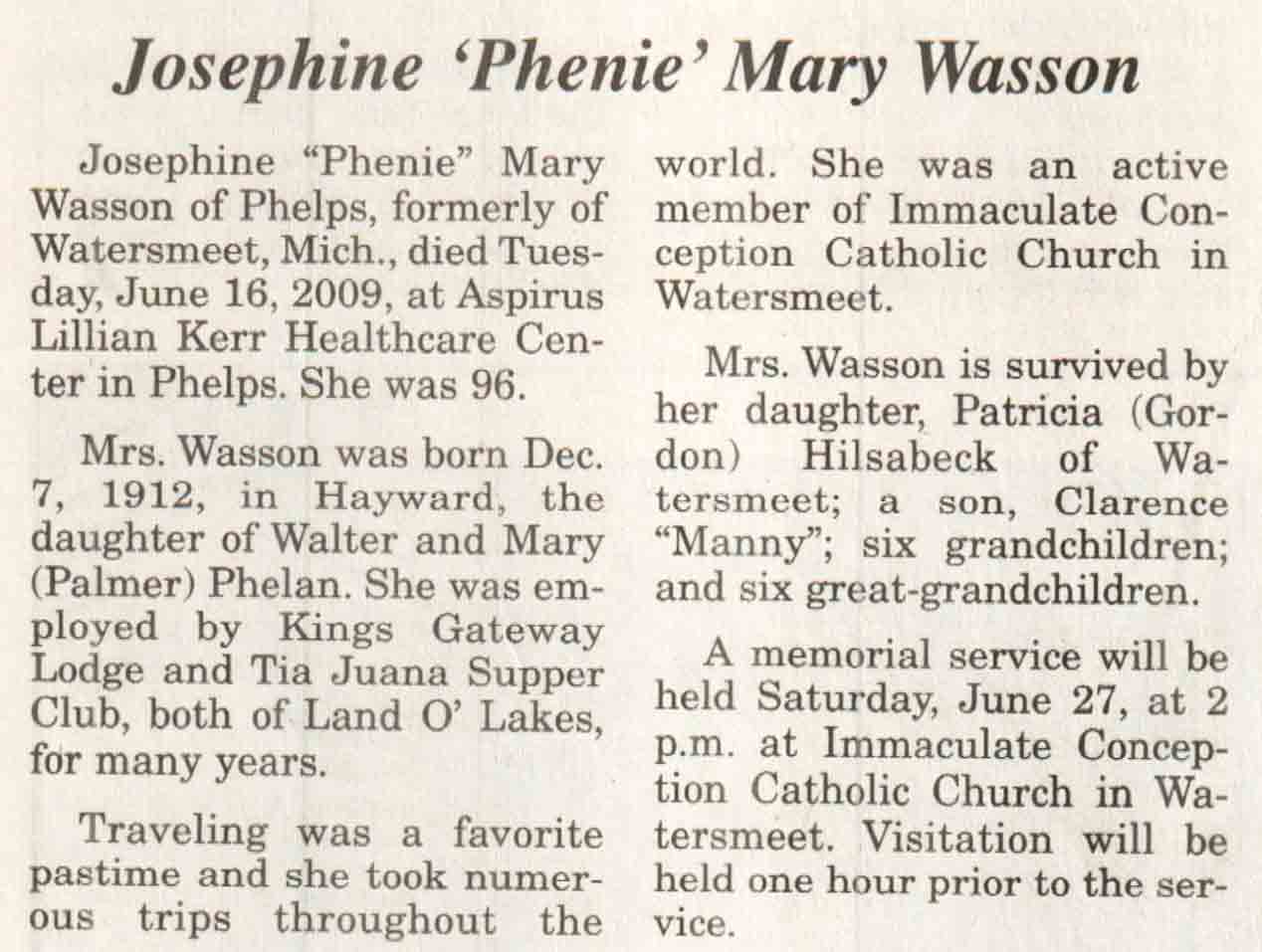 | Wasson | Josephine Mary 'Phenie' (Phelan) | 07 Dec 1912 | 16 Jun 2009 | V N-R | 24 Jun 2009 | 4A |