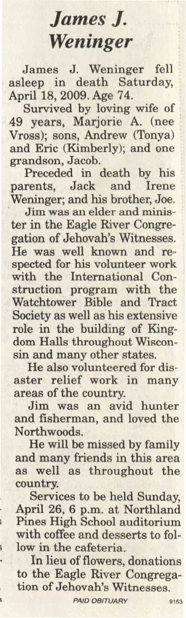 | Weninger | James J | c 1935 | 18 Apr 2009 | V N-R | 22 Apr 2009 | 4 |