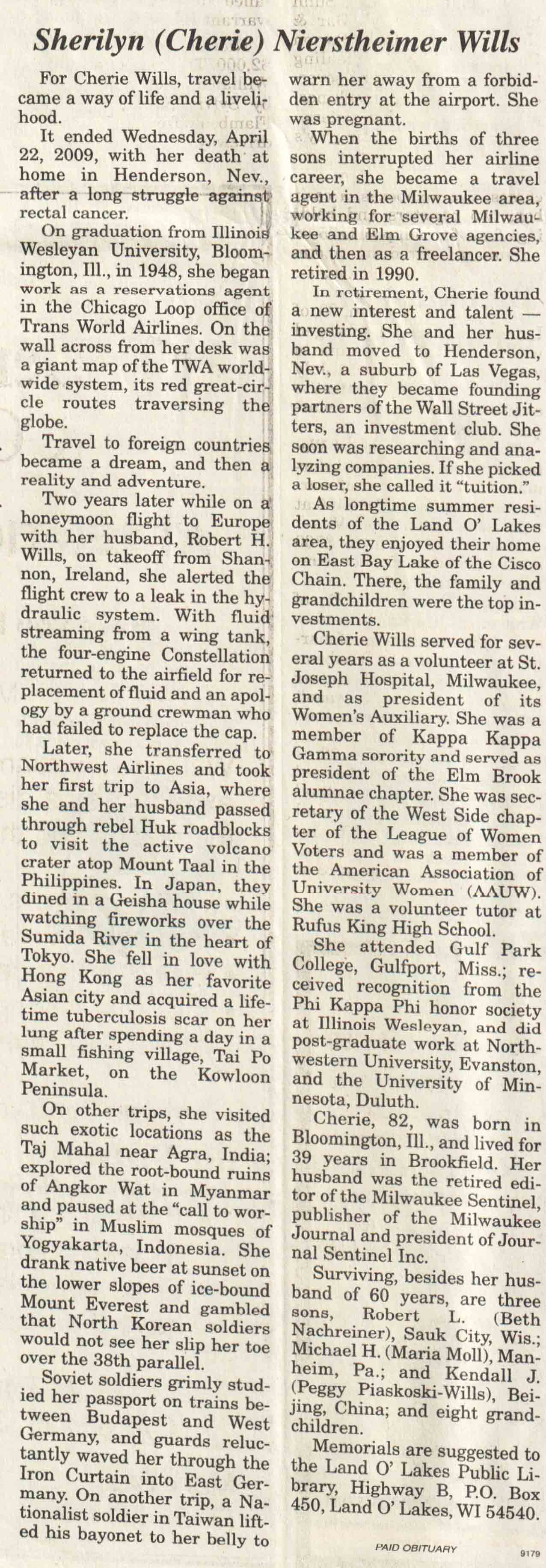 | Wills | Sherilyn 'Cherie' (Nierstheimer) | c 1927 | 22 Apr 2009 | V N-R | 29 Apr 2009 | 4 |