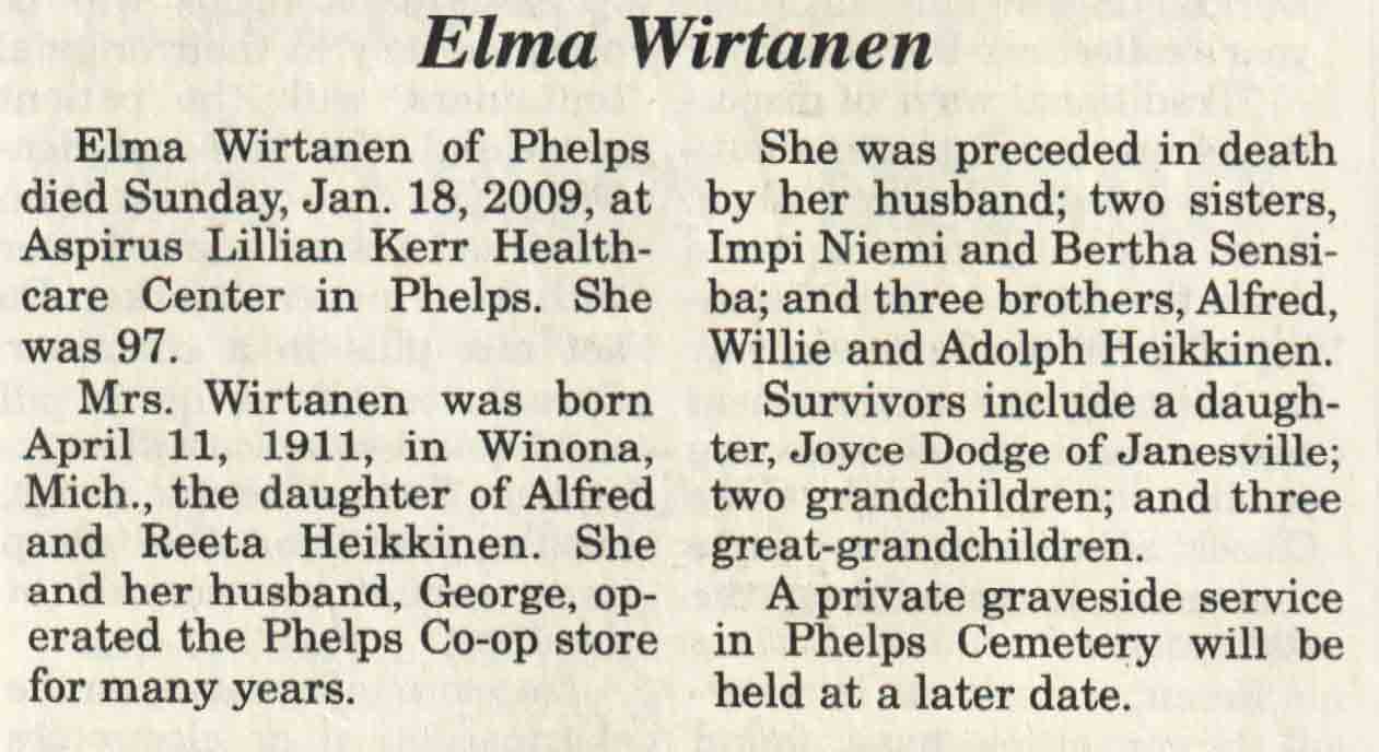 | Wirtanen | Elma (Heikkinen) | 11 Apr 1911 | 18 Jan 2009 | V N-R | 08 Apr 2009 | 4 |