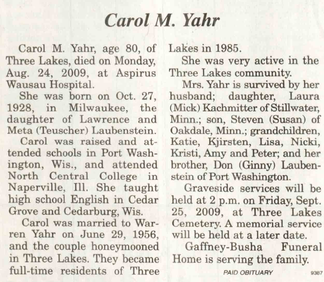 | Yahr | Carol M (Laubenstein) | 27 Oct 1928 | 24 Aug 2009 | V N-R | 16 Sep 2009 | 4A |