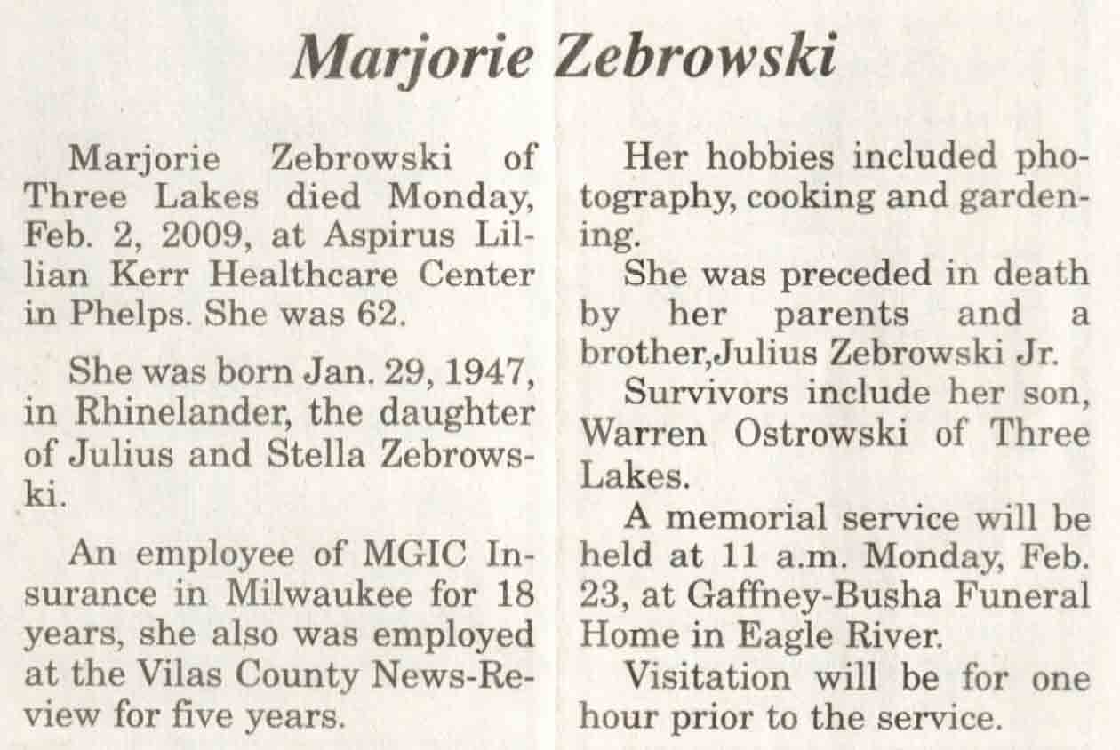 | Zebrowski | Marjorie | 29 Jan 1947 | 02 Feb 2009 | V N-R | 18 Feb 2009 | 4A |