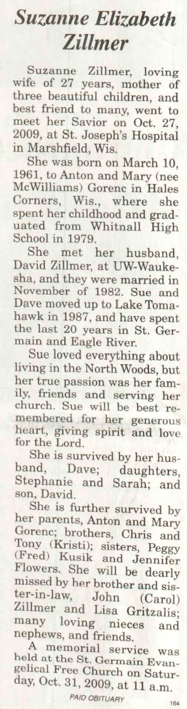 | Zillmer | Suzanne Elizabeth (Gorenc) | 10 Mar 1961 | 27 Oct 2009 | V N-R | 04 Nov 2009 | 4A |