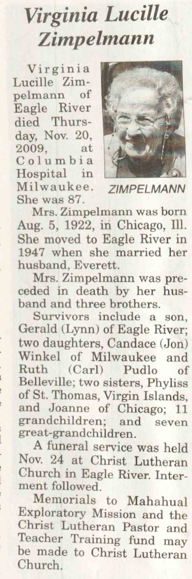 | Zimpelmann | Virginia Lucile | 05 Aug 1922 | 20 Nov 2009 | V N-R | 25 Nov 2009 | 4A |