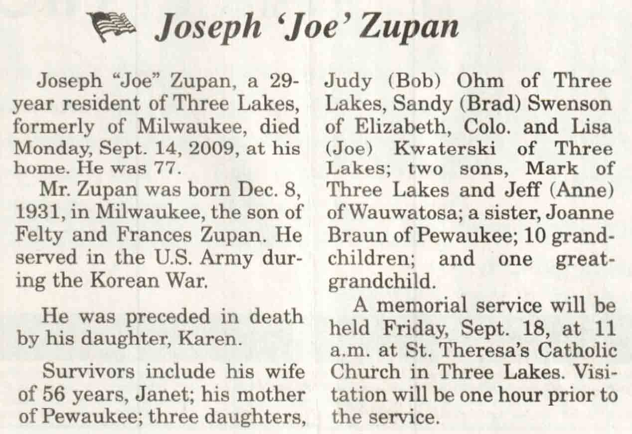 | Zupan | Joseph 'Joe' | 08 Dec 1931 | 14 Sep 2009 | V N-R | 16 Sep 2009 | 4A |