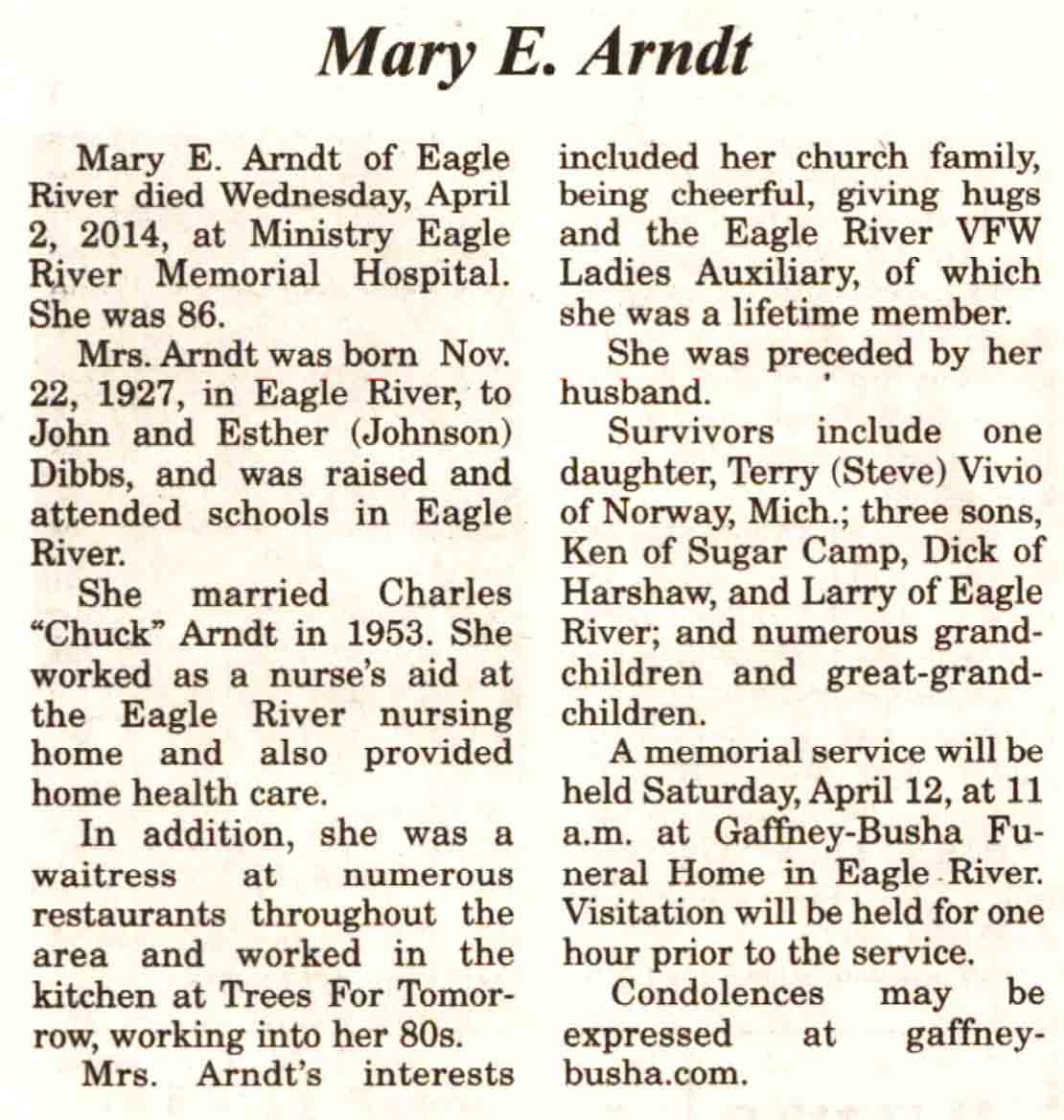 | Arndt | Mary E (Dibbs) | 22 Nov 1927 | 02 Apr 2014 | V N-R | 09 Apr 2014 | 4 |