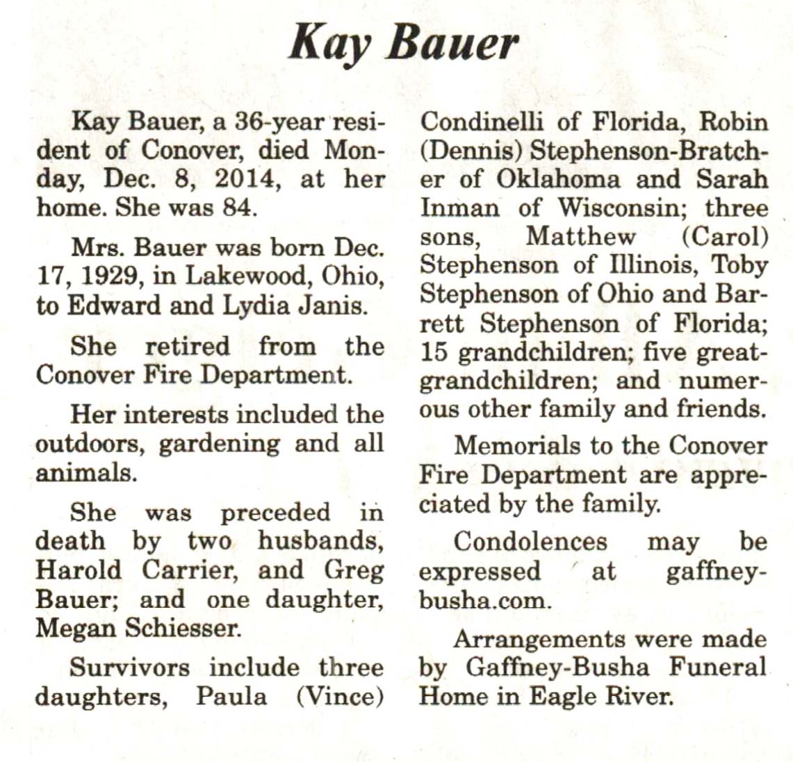 | Bauer | Kay (Janis) | 17 Dec 1929 | 08 Dec 2014 | V N-R | 17 Dec 2014 | 4 |