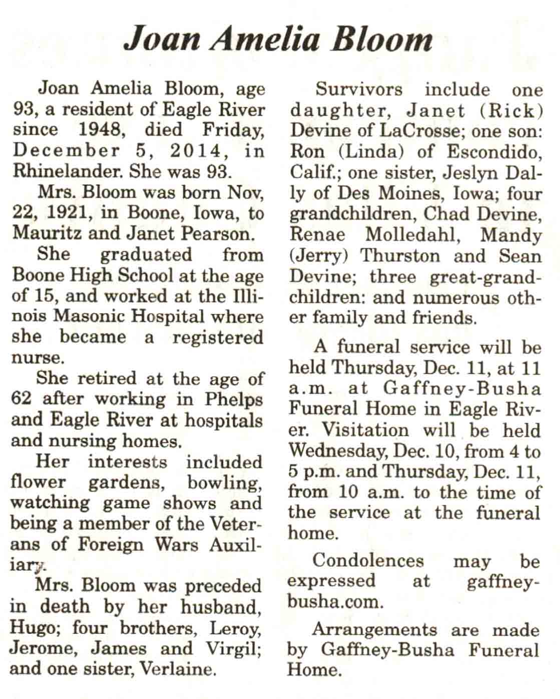 | Bloom | Joan Amelia (Pearson) | 22 Nov 1921 | 05 Dec 2014 | V N-R | 10 Dec 2014 | 4 |