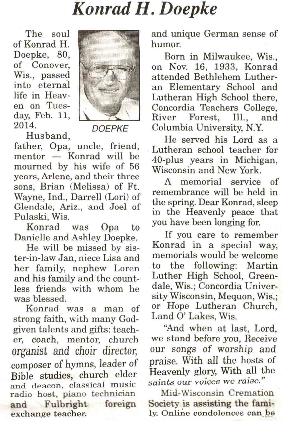 | Doepke | Konard H | 16 Nov 1933 | 11 Feb 2014 | V N-R | 19 Feb 2014 | 4 |