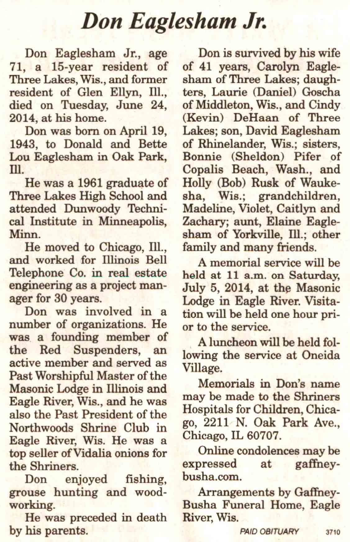 | Eaglesham | Don, Jr | 19 Apr 1943 | 24 Jun 2014 | V N-R | 02 Jul 2014 | 4A |