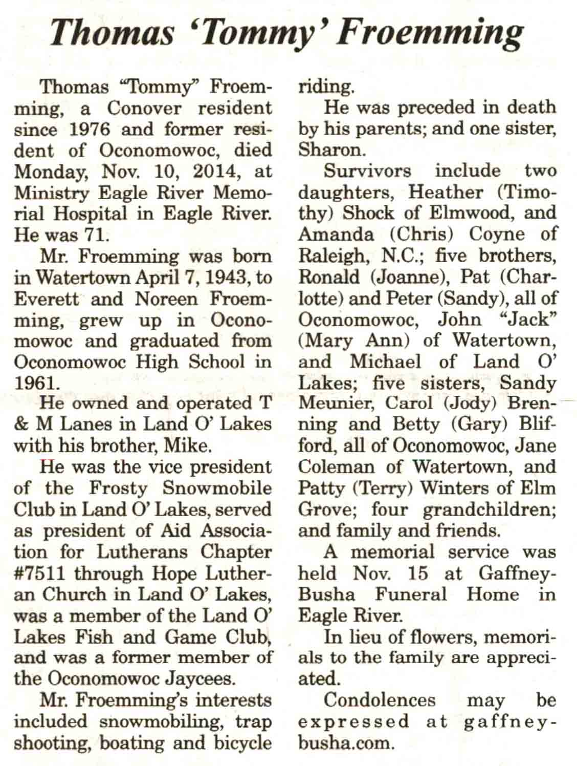 | Froemming | Thomas 'Tommy' | 07 Apr 1943 | 10 Nov 2014 | V N-R | 19 Nov 2014 | 4A |