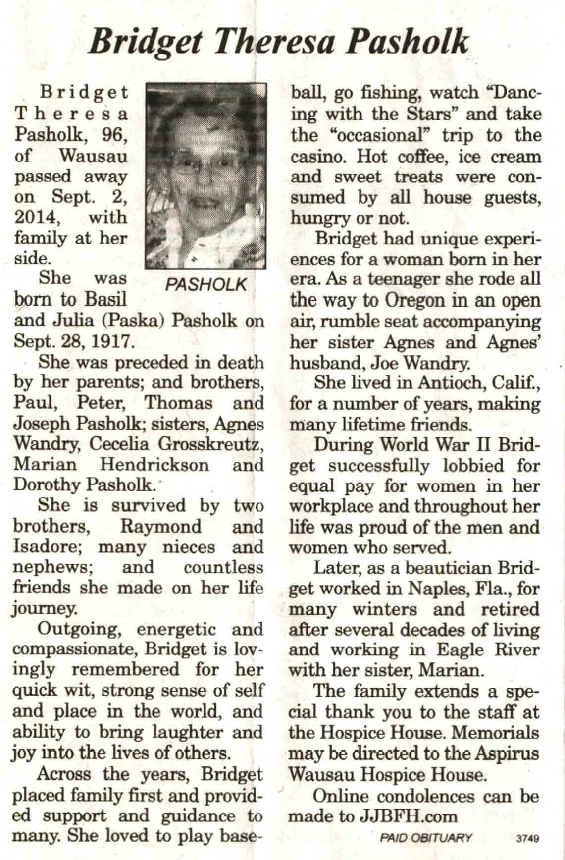 | Pasholk | Bridget Theresa | 28 Sep 1917 | 02 Sep 2014 | V N-R | 17 Sep 2014 | 4A |