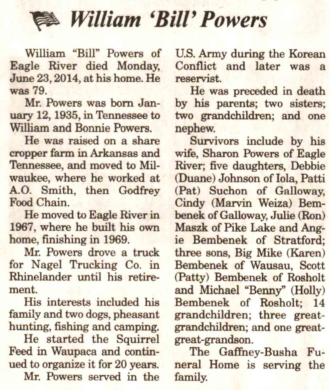 | Powers | William 'Bill' | 12 Jan 1935 | 23 Jun 2014 | V N-R | 02 Jul 2014 | 4A |