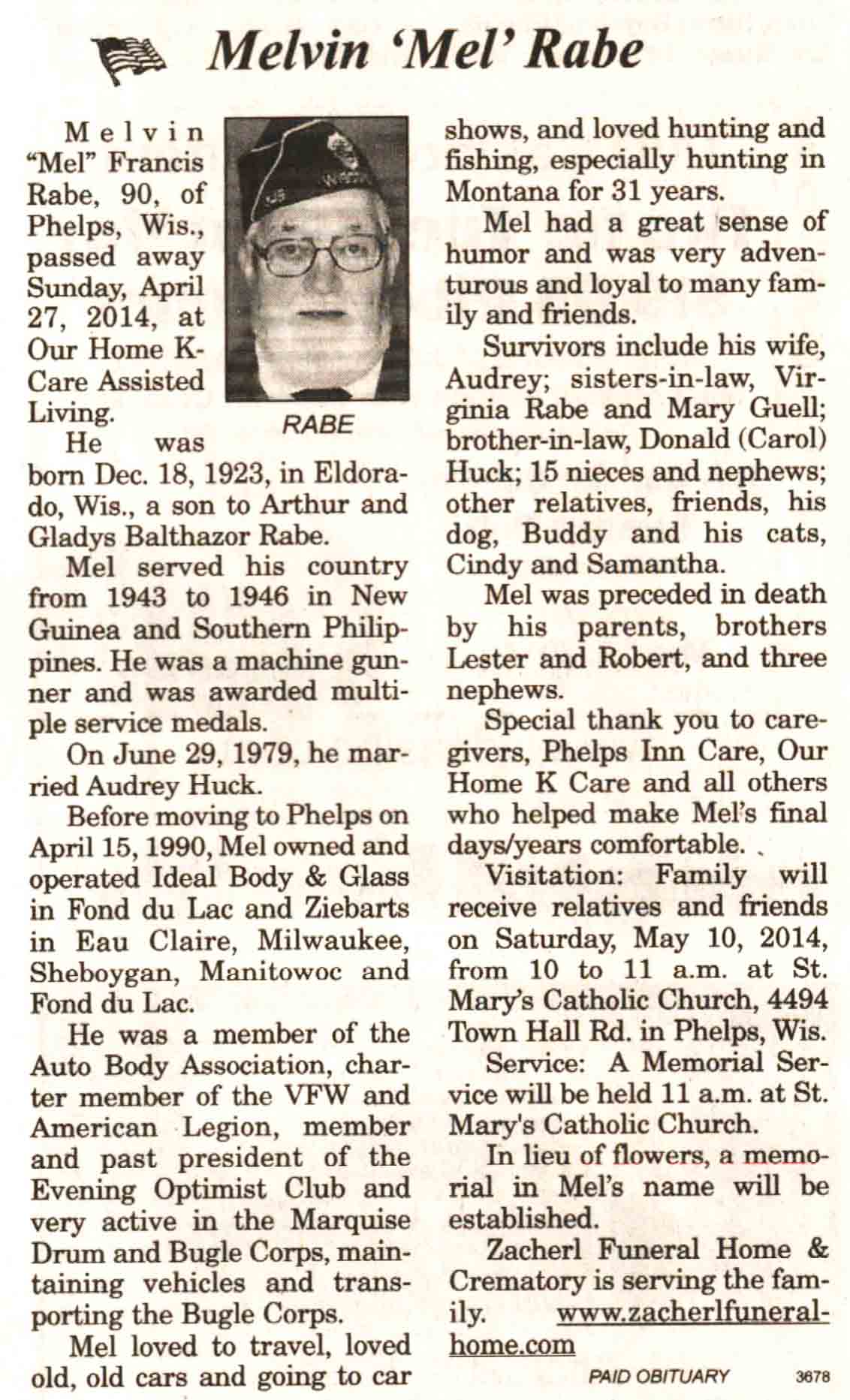 | Rabe | Melvin 'Mel' | 18 Dec 1923 | 27 Apr 2014 | V N-R | 07 May 2014 | 4A |